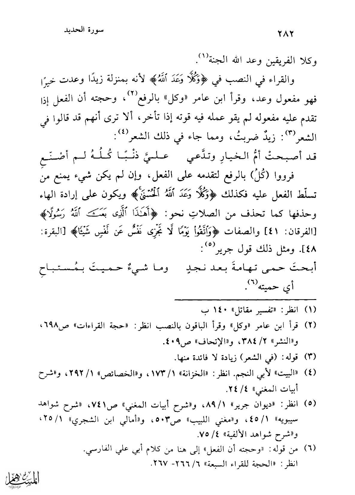فرووا (كُلُ) بالرفع لتقدمه على الفعل، وإن لم يكن شيء يمنع من تسلّط الفعل عليه فكذلك {وَكُلًّا وَعَدَ اللَّهُ الْحُسْنَى} ويكون على إرادة الهاء وحذفها كما تحذف من الصلاتِ نحو: {أَهَذَا الَّذِي بَعَثَ اللَّهُ رَسُولًا} [الفرقان: 41] والصفات {وَاتَّقُوا يَوْمًا لَا تَجْزِي نَفْسٌ عَنْ نَفْسٍ شَيْئًا} [البقرة: 48]. ومثل ذلك قول جرير (¬5):