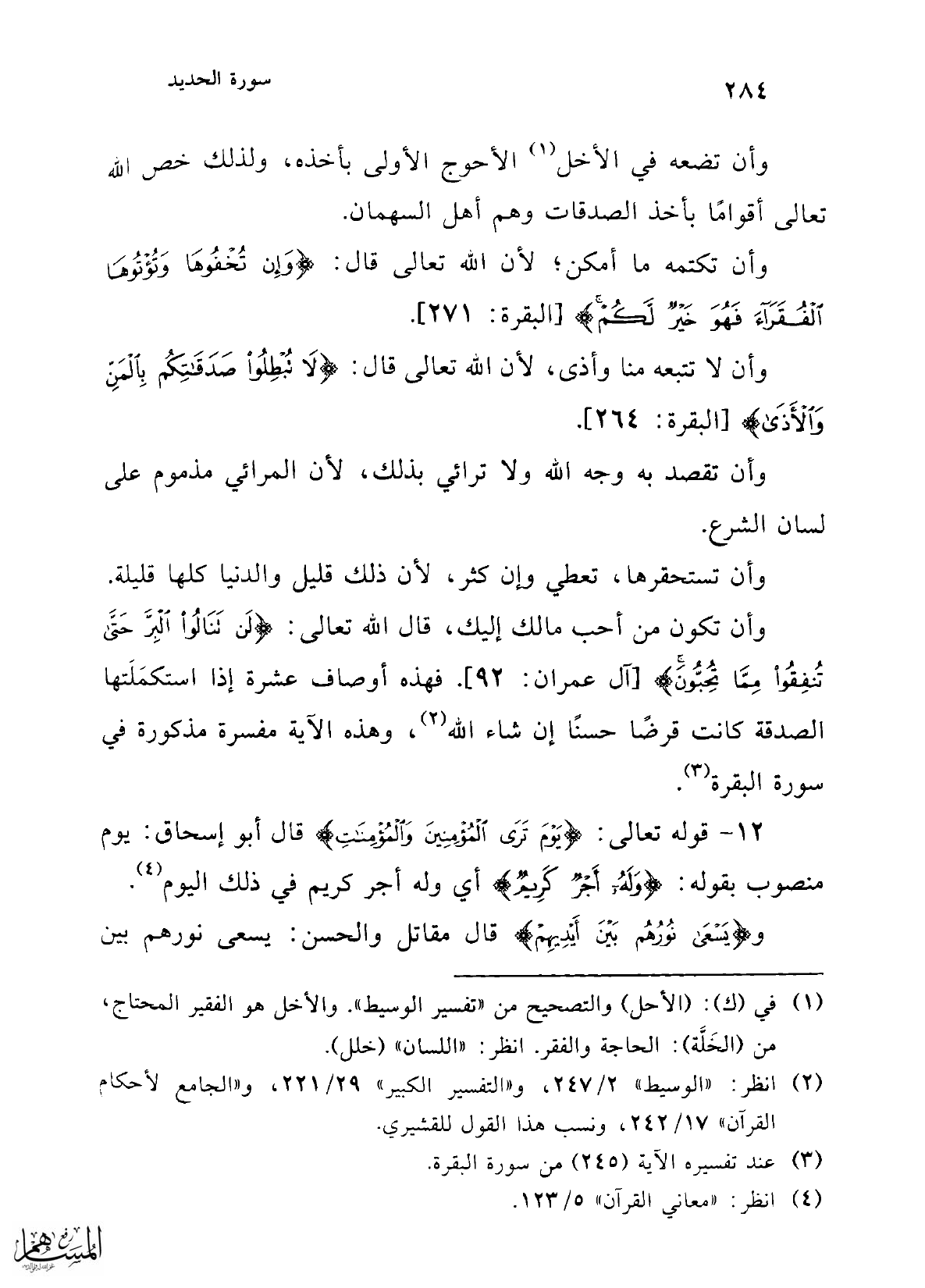 وأن تكون من أحب مالك إليك، قال الله تعالى: {لَنْ تَنَالُوا الْبِرَّ حَتَّى تُنْفِقُوا مِمَّا تُحِبُّونَ} [آل عمران: 92]. فهذه أوصاف عشرة إذا استكمَلَتها الصدقة كانت قرضًا حسنًا إن شاء الله (¬2)، وهذه الآية مفسرة مذكورة في سورة البقرة (¬3).