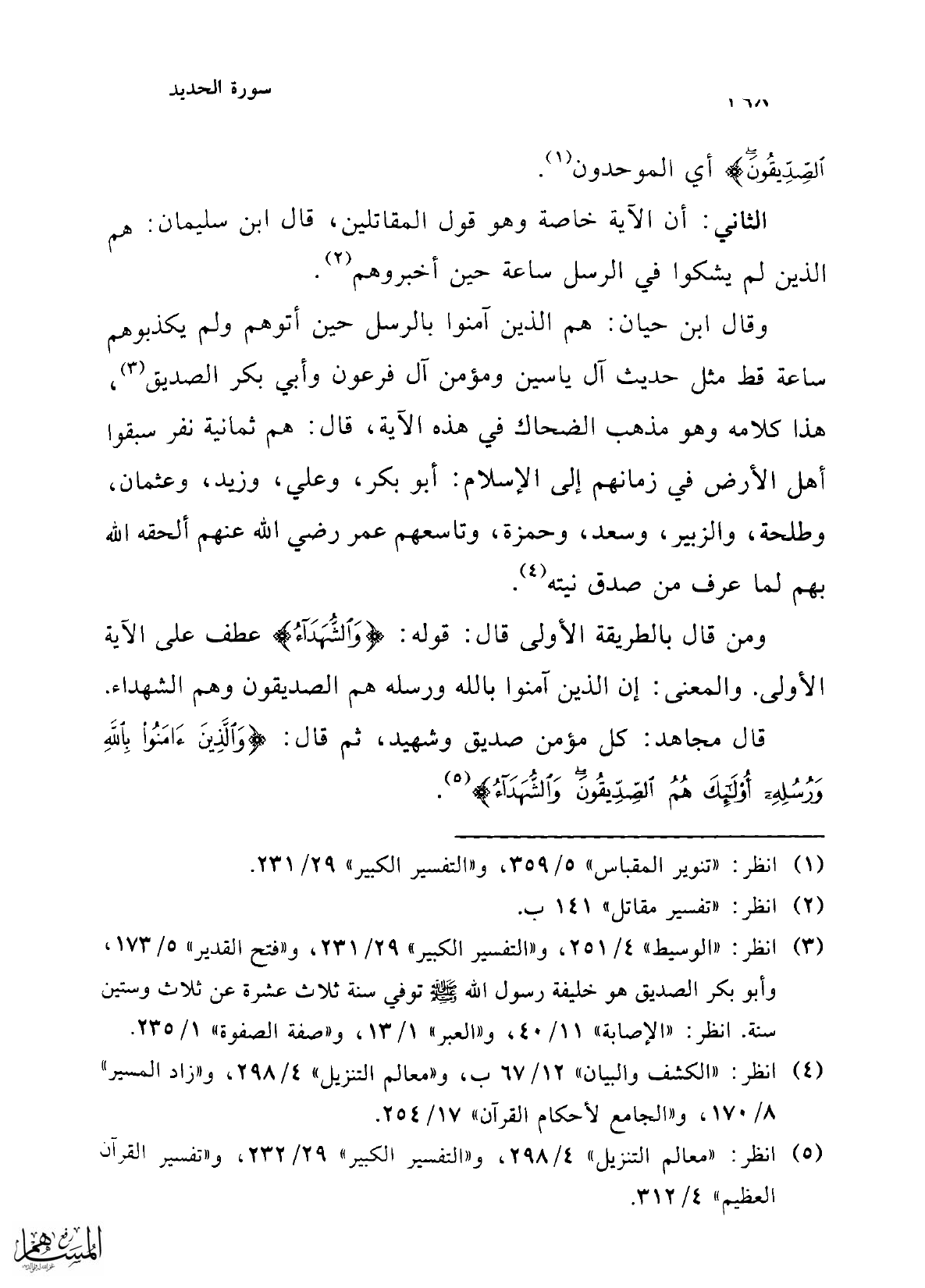 قال مجاهد: كل مؤمن صديق وشهيد، ثم قال: {وَالَّذِينَ آمَنُوا بِاللَّهِ وَرُسُلِهِ أُولَئِكَ هُمُ الصِّدِّيقُونَ وَالشُّهَدَاءُ} (¬5).