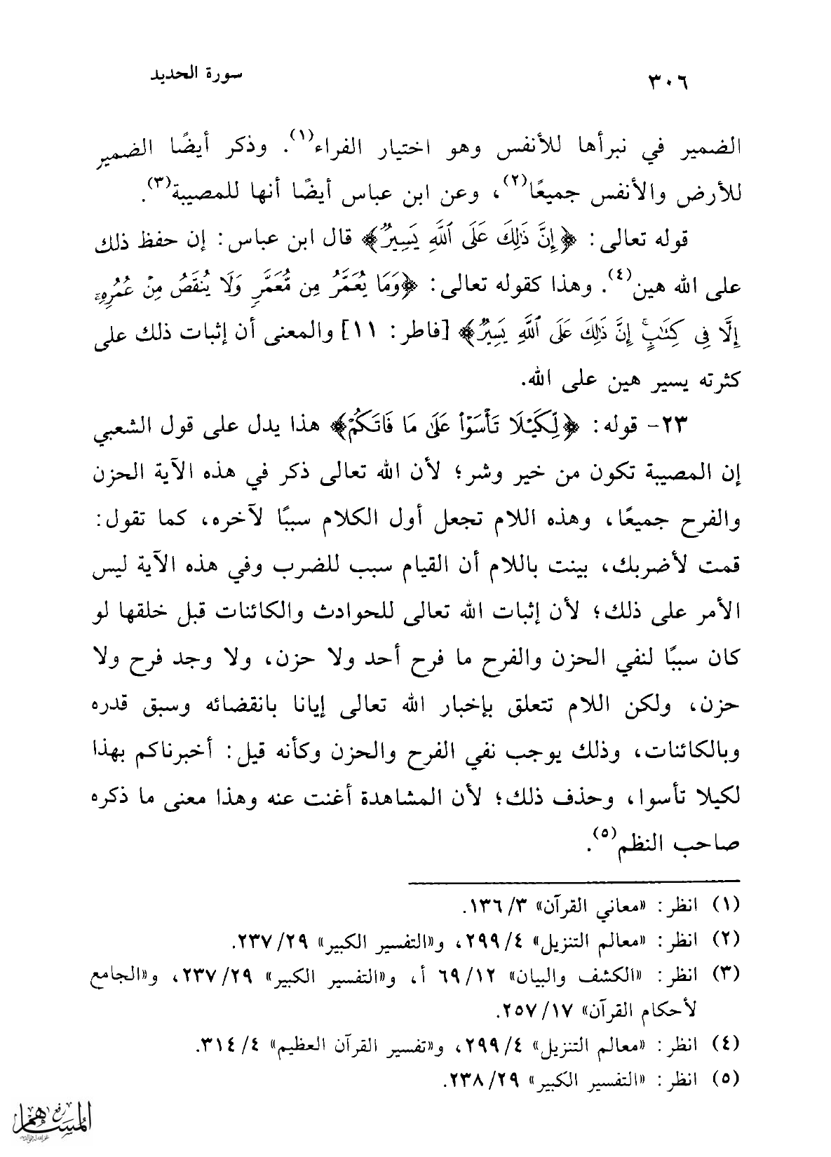 23 - قوله: {لِكَيْلَا تَأْسَوْا عَلَى مَا فَاتَكُمْ} هذا يدل على قول الشعبي إن المصيبة تكون من خير وشر؛ لأن الله تعالى ذكر في هذه الآية الحزن والفرح جميعًا، وهذه اللام تجعل أول الكلام سببًا لآخره، كما تقول: قمت لأضربك، بينت باللام أن القيام سبب للضرب وفي هذه الآية ليس الأمر على ذلك؛ لأن إثبات الله تعالى للحوادث والكائنات قبل خلقها لو كان سببًا لنفي الحزن والفرح ما فرح أحد ولا حزن، ولا وجد فرح ولا حزن، ولكن اللام تتعلق بإخبار الله تعالى إيانا بانقضائه وسبق قدره وبالكائنات، وذلك يوجب نفي الفرح والحزن وكأنه قيل: أخبرناكم بهذا لكيلا تأسوا، وحذف ذلك؛ لأن المشاهدة أغنت عنه وهذا معنى ما ذكره صاحب النظم (¬5).