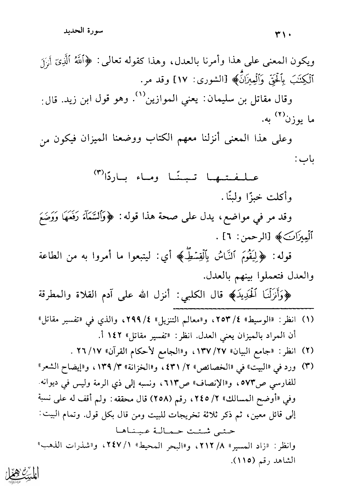 (¬1) انظر: "الوسيط" 4/ 253، و"معالم التنزيل" 4/ 299، والذي في "تفسير مقاتل" أن المراد بالميزان يعني العدل. انظر: "تفسير مقاتل" 142 أ.