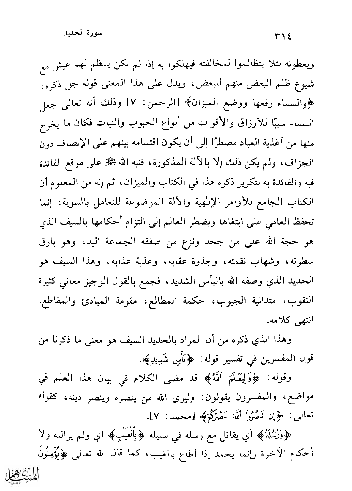 ويعطونه لئلا يتظالموا لمخالفته فيهلكوا به إذا لم يكن ينتظم لهم عيش مع شيوع ظلم البعض منهم للبعض، ويدل على هذا المعنى قوله جل ذكره: {وَالسَّمَاءَ رَفَعَهَا وَوَضَعَ الْمِيزَانَ} [الرحمن: 7] وذلك أنه تعالى جعل السماء سببًا للأرزاق والأقوات من أنواع الحبوب والنبات فكان ما يخرج منها من أغذية العباد مضطرًا إلى أن يكون اقتسامه بينهم على الإنصاف دون الجزاف، ولم يكن ذلك إلا بالآلة المذكورة، فنبه الله -عَزَّ وَجَلَّ- على موقع الفائدة فيه والفائدة به بتكرير ذكره هذا في الكتاب والميزان, ثم إنه من المعلوم أن الكتاب الجامع للأوامر الإلهية والآلة الموضوعة للتعامل بالسوية، إنما تحفظ العامي على ابتغاها ويضطر العالم إلى التزام أحكامها بالسيف الذي هو حجة الله على من جحد ونزع من صفقه الجماعة اليد، وهو بارق سطوته، وشهاب نقمته، وجذوة عقابه، وعذبة عذابه، وهذا السيف هو الحديد الذي وصفه الله بالبأس الشديد، فجمع بالقول الوجيز معاني كثيرة النقوب، متدانية الجيوب، حكمة المطالع، مقومة المبادئ والمقاطع. انتهى كلامه.