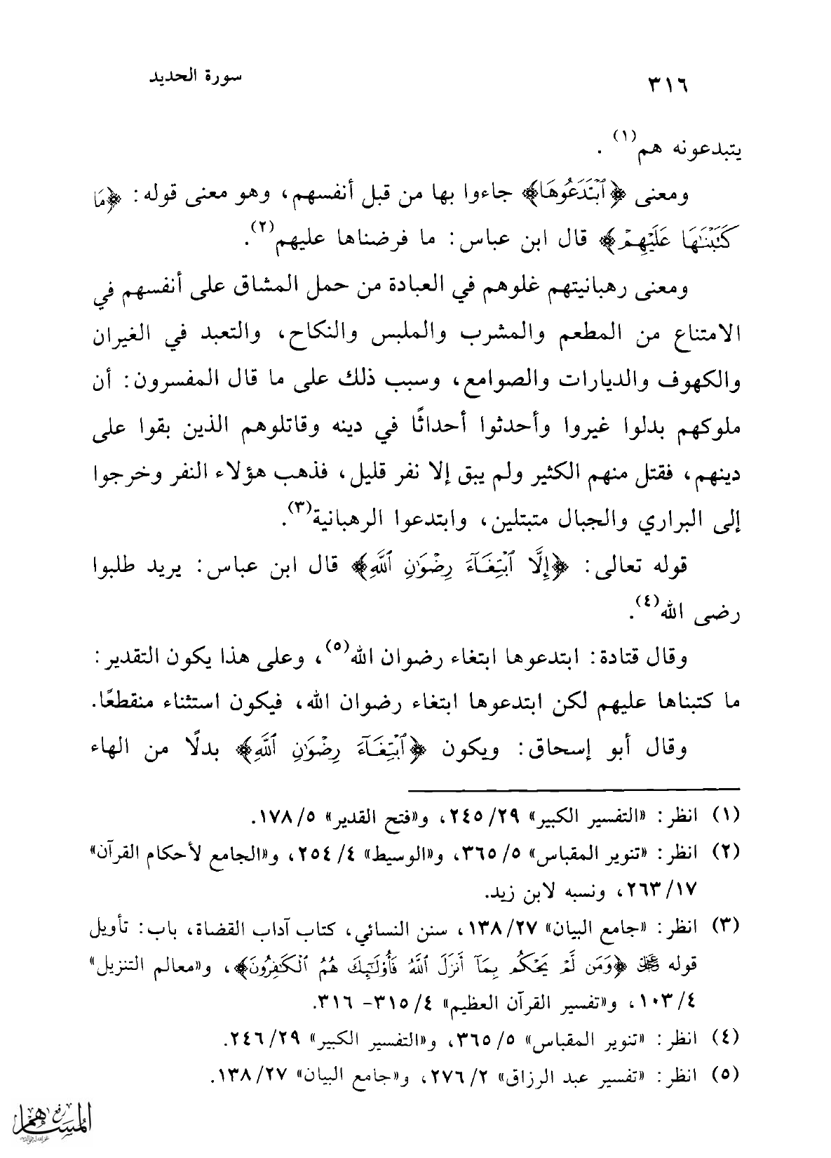 ومعنى رهبانيتهم غلوهم في العبادة من حمل المشاق على أنفسهم في الامتناع من المطعم والمشرب والملبس والنكاح، والتعبد في الغيران والكهوف والديارات والصوامع، وسبب ذلك على ما قال المفسرون: أن ملوكهم بدلوا غيروا وأحدثوا أحداثًا في دينه وقاتلوهم الذين بقوا على دينهم، فقتل منهم الكثير ولم يبق إلا نفر قليل، فذهب هؤلاء النفر وخرجوا إلى البراري والجبال متبتلين، وابتدعوا الرهبانية (¬3).