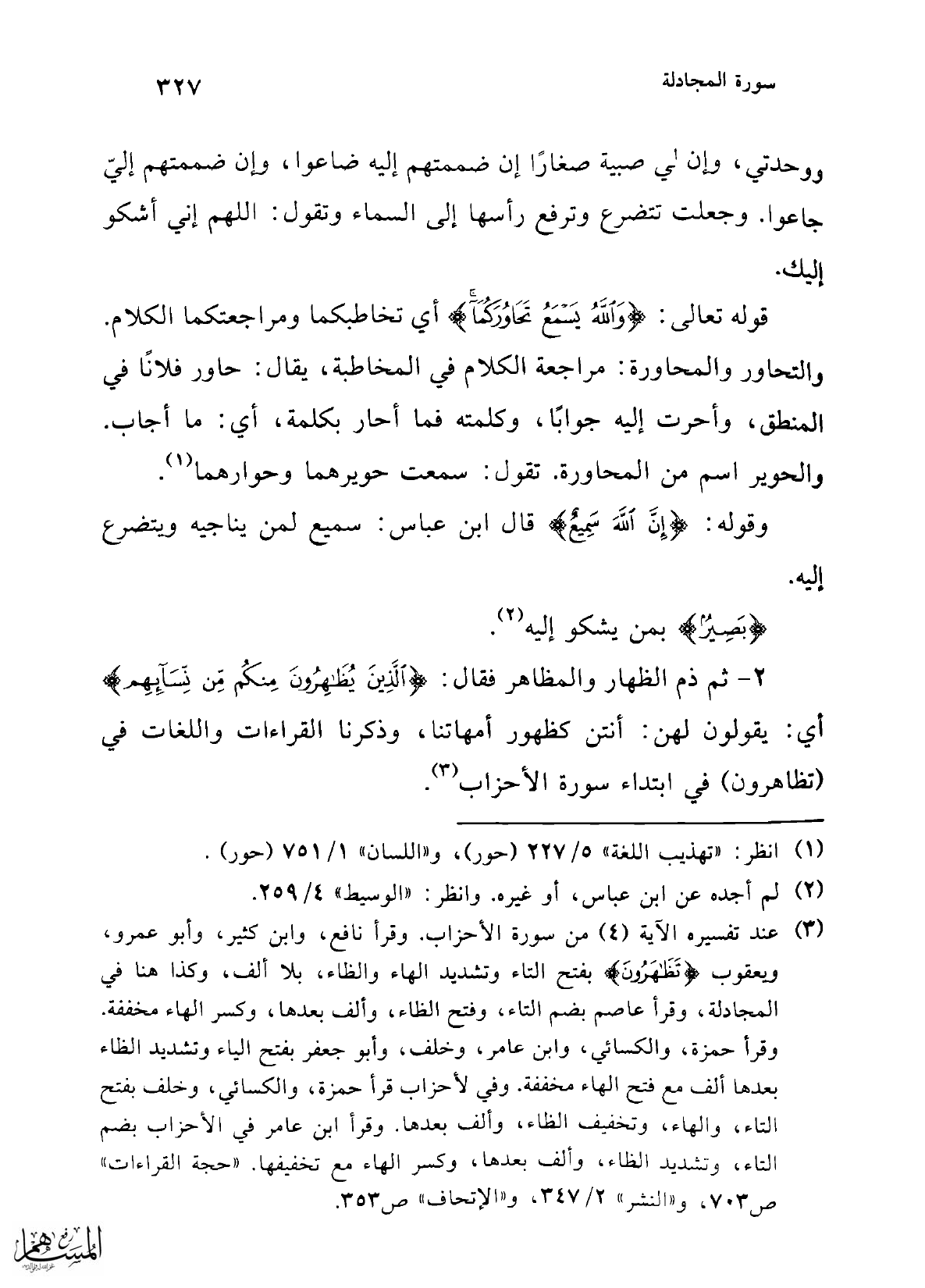 قوله تعالى: {وَاللَّهُ يَسْمَعُ تَحَاوُرَكُمَا} أي تخاطبكما ومراجعتكما الكلام. والتحاور والمحاورة: مراجعة الكلام في المخاطبة، يقال: حاور فلانًا في المنطق، وأحرت إليه جوابًا، وكلمته فما أحار بكلمة، أي: ما أجاب. والحوير اسم من المحاورة. تقول: سمعت حويرهما وحوارهما (¬1).