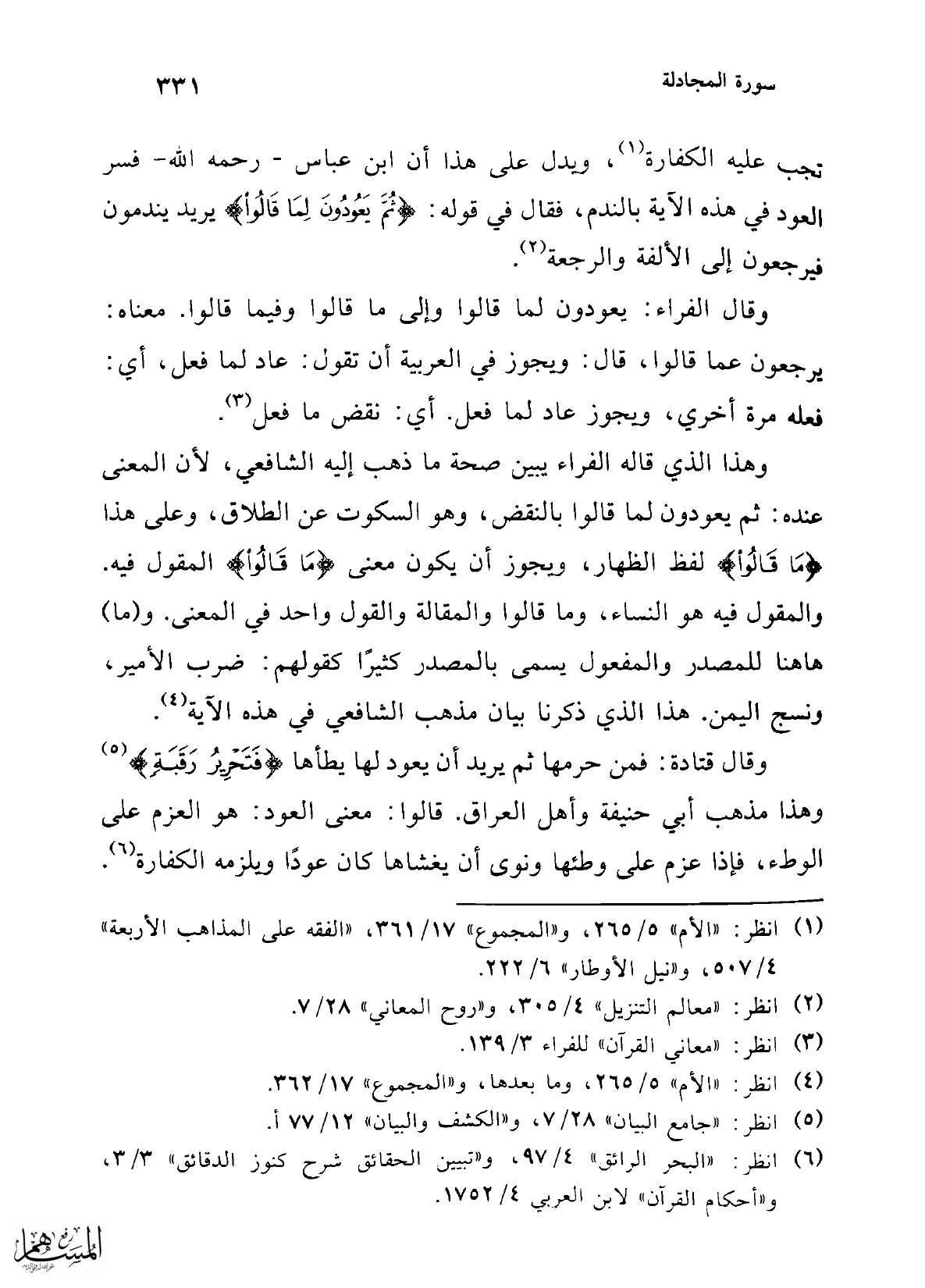 وهذا الذي قاله الفراء يبين صحة ما ذهب إليه الشافعي, لأن المعنى عنده: ثم يعودون لما قالوا بالنقض، وهو السكوت عن الطلاق، وعلى هذا {مَا قَالُوا} لفظ الظهار، ويجوز أن يكون معنى {مَا قَالُوا} المقول فيه. والمقول فيه هو النساء، وما قالوا والمقالة والقول واحد في المعنى. و (ما) هاهنا للمصدر والمفعول يسمى بالمصدر كثيرًا كقولهم: ضرب الأمير، ونسج اليمن. هذا الذي ذكرنا بيان مذهب الشافعي في هذه الآية (¬4).
