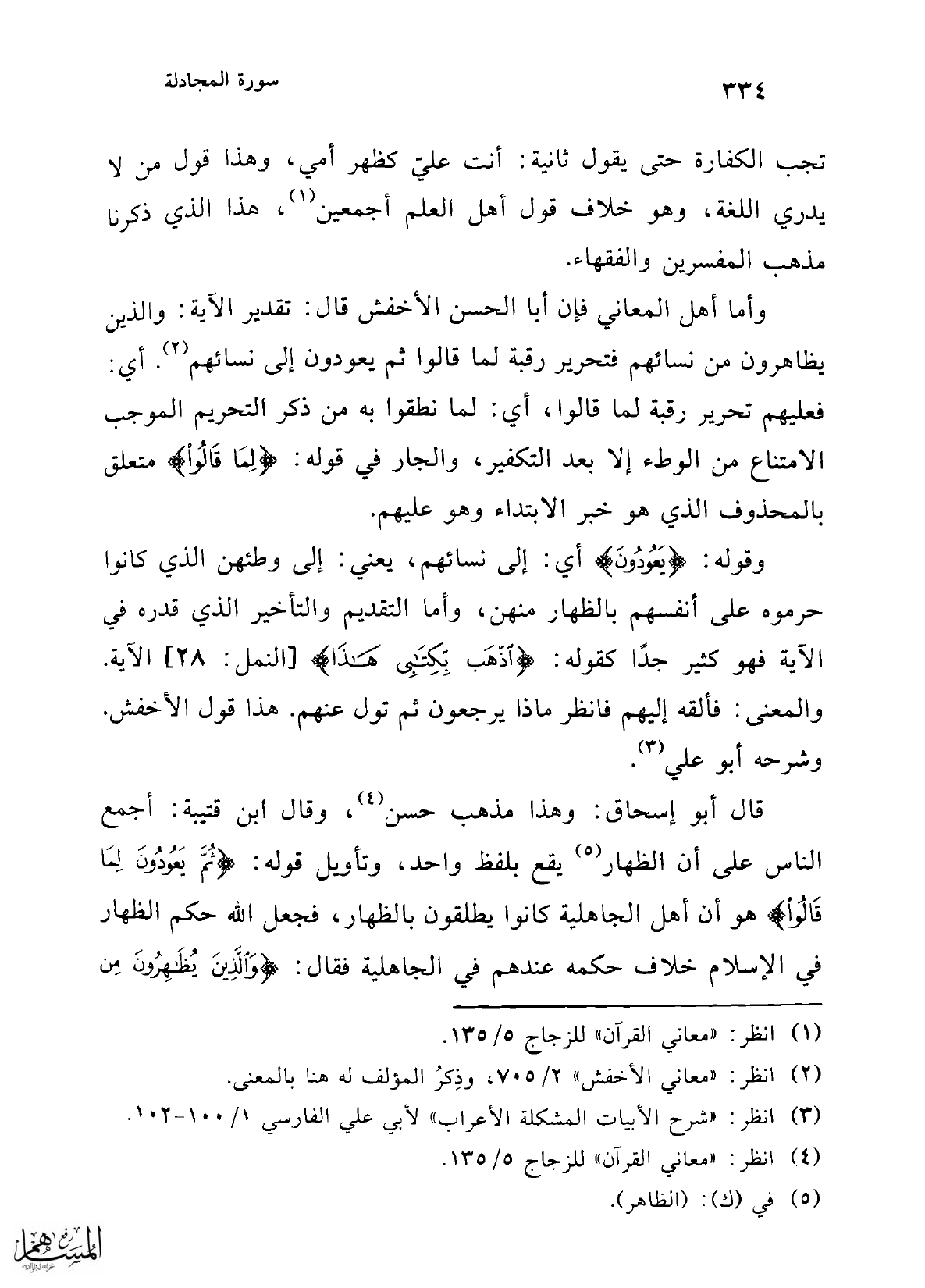 وقوله: {يَعُودُونَ} أي: إلى نسائهم، يعني: إلى وطئهن الذي كانوا حرموه على أنفسهم بالظهار منهن، وأما التقديم والتأخير الذي قدره في الآية فهو كثير جدًا كقوله: {اذْهَبْ بِكِتَابِي هَذَا} [النمل: 28] الآية. والمعنى: فألقه إليهم فانظر ماذا يرجعون ثم تول عنهم. هذا قول الأخفش. وشرحه أبو علي (¬3).