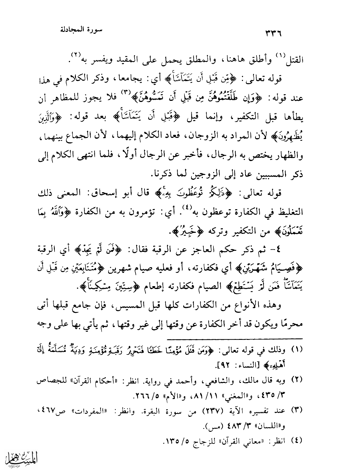 قوله تعالى: {مِنْ قَبْلِ أَنْ يَتَمَاسَّا} أي: يجامعا، وذكر الكلام في هذا عند قوله: {وَإِنْ طَلَّقْتُمُوهُنَّ مِنْ قَبْلِ أَنْ تَمَسُّوهُنَّ} (¬3) فلا يجوز للمظاهر أن يطأها قبل التكفير، وإنما قيل {قَبْلِ أَنْ يَتَمَاسَّا} بعد قوله: {وَالَّذِينَ يُظَاهِرُونَ} لأن المراد به الزوجان، فعاد الكلام إليهما؛ لأن الجماع بينهما، والظهار يختص به الرجال، فأخبر عن الرجال أولاً، فلما انتهى الكلام إلى ذكر المسببين عاد إلى الزوجين لما ذكرنا.
