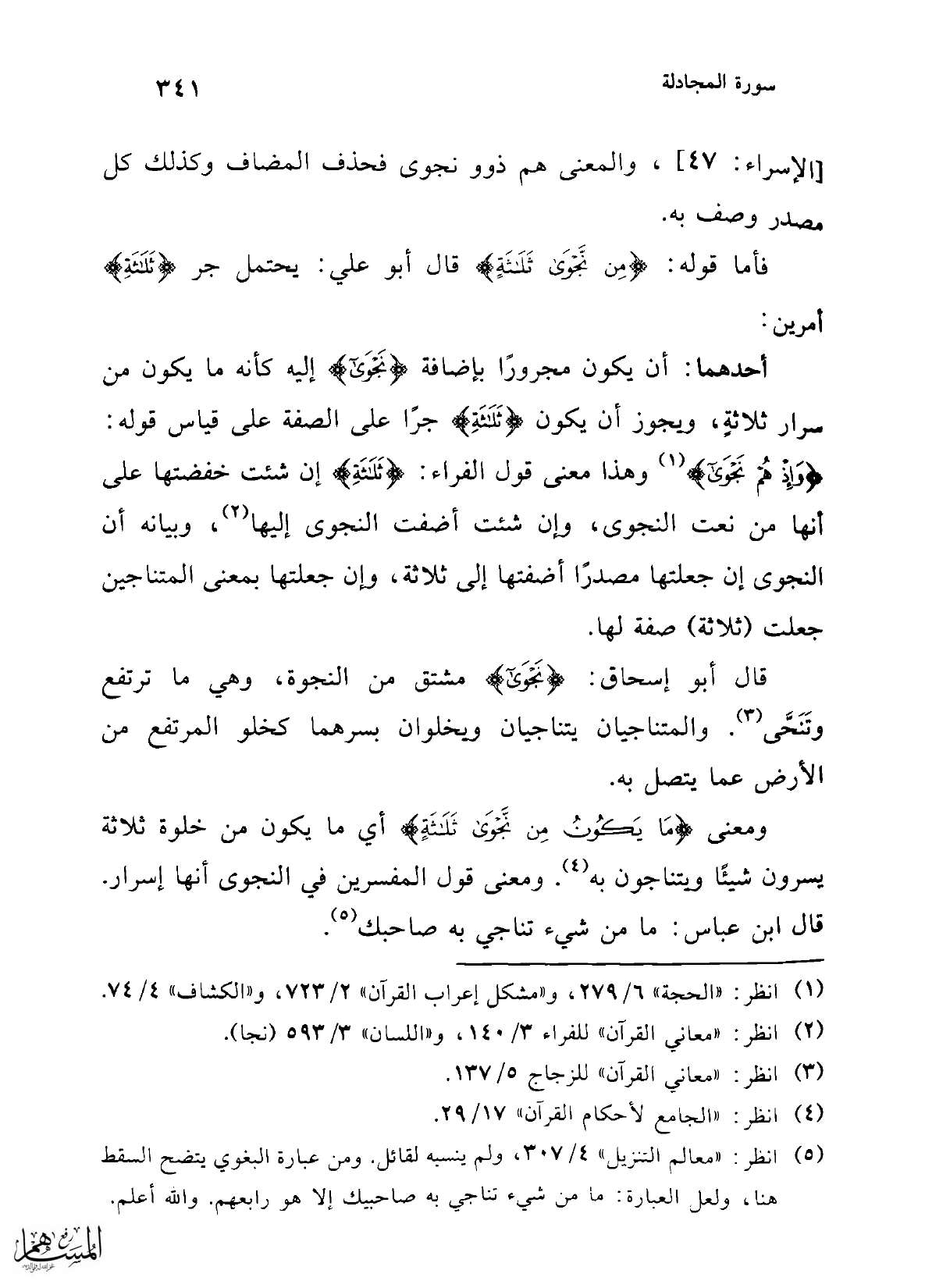 فأما قوله: {مِنْ نَجْوَى ثَلَاثَةٍ} قال أبو علي: يحتمل جر {ثَلَاثَةٍ} أمرين: