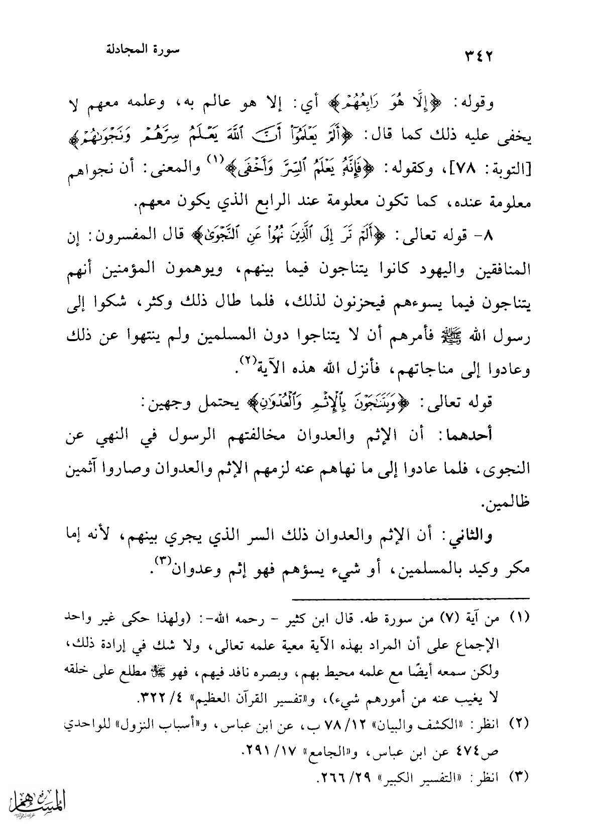 (¬1) من آية (7) من سورة طه. قال ابن كثير -رحمه الله-؛ (ولهذا حكى غير واحد الإجماع على أن المراد بهذه الآية معية علمه تعالى، ولا شك في إرادة ذلك, ولكن سمعه أيضًا مع علمه محيط بهم، وبصره نافد فيهم، فهو -عَزَّ وَجَلَّ- مطلع على خلقه لا يغيب عنه من أمورهم شيء)، و"تفسير القرآن العظيم" 4/ 322.