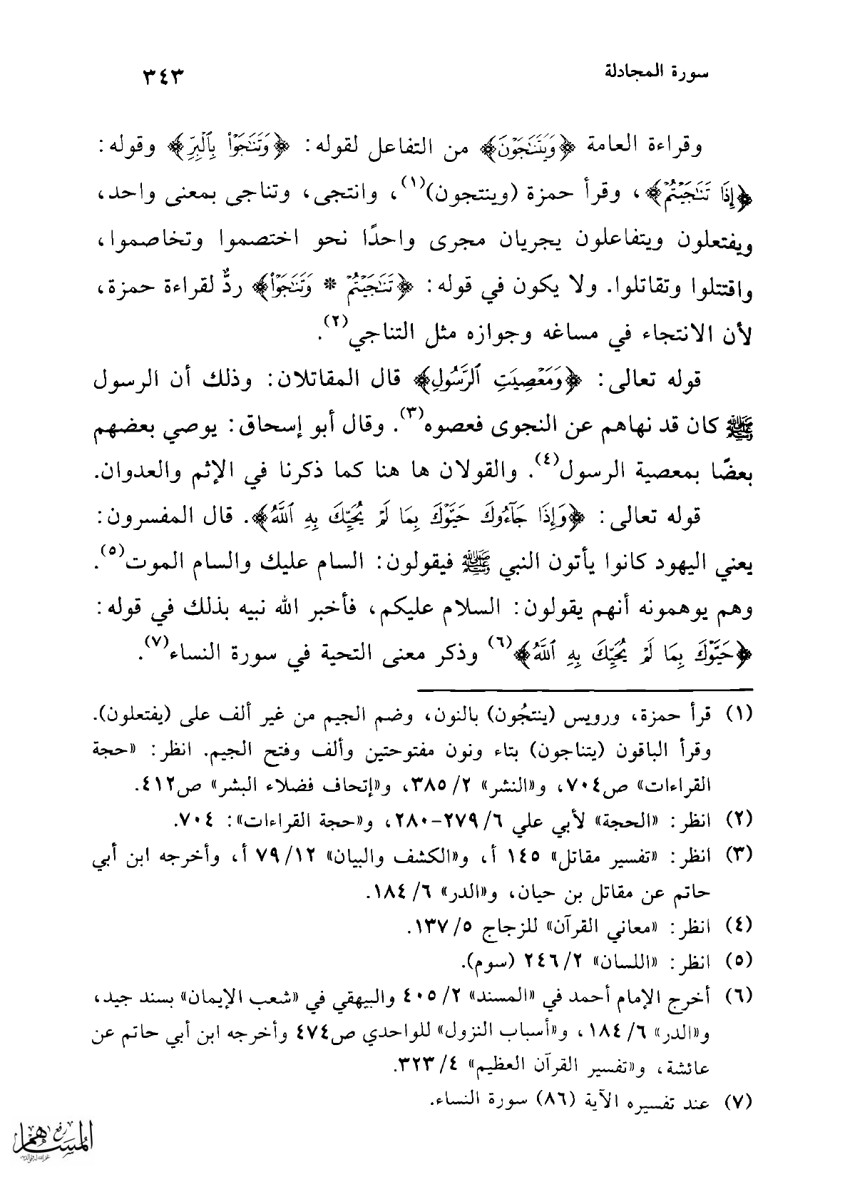 (¬1) قرأ حمزة، ورويس (ينتجُون) بالنون، وضم الجيم من غير ألف على (يفتعلون). وقرأ الباقون (يتناجون) بتاء ونون مفتوحتين وألف وفتح الجيم. انظر: "حجة القراءات" ص 704، و"النشر" 2/ 385، و"إتحاف فضلاء البشر" ص 412.