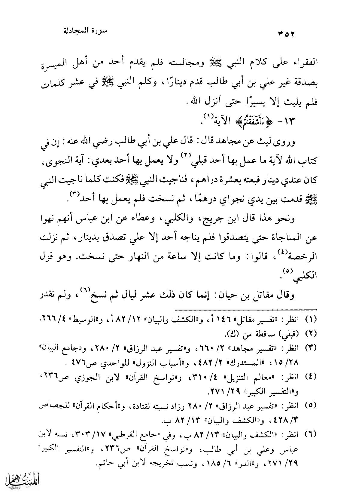 وروى ليث عن مجاهد قال: قال علي بن أبي طالب رضي الله عنه: إن في كتاب الله لآية ما عمل بها أحد قبلي (¬2) ولا يعمل بها أحد بعدي: آية النجوى، كان عندي دينار فبعته بعشرة دراهم، فناجيت النبي -صلى الله عليه وسلم- فكنت كلما ناجيت النبي -صلى الله عليه وسلم- قدمت بين يدي نجواي درهمًا، ثم نسخت فلم يعمل بها أحد (¬3).
