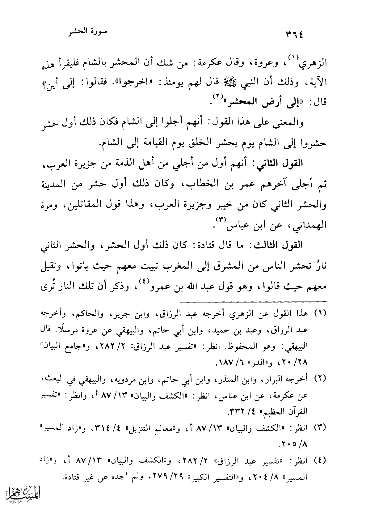 القول الثالث: ما قال قتادة: كان ذلك أول الحشر، والحشر الثاني نارُ تحشر الناس من المشرق إلى المغرب تبيت معهم حيث باتوا، وتقيل معهم حيث قالوا، وهو قول عبد الله بن عمرو (¬4)، وذكر أن تلك النار تُرى