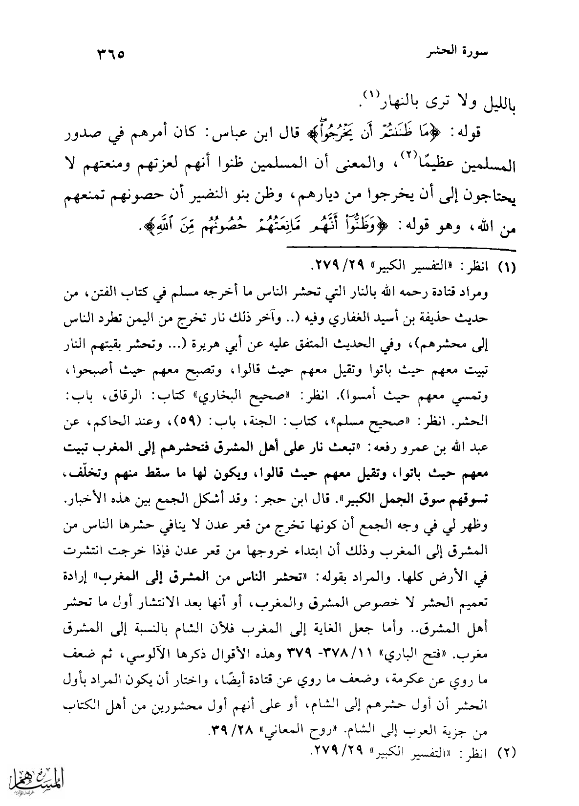 ومراد قتادة رحمه الله بالنار التي تحشر الناس ما أخرجه مسلم في كتاب الفتن، من حديث حذيفة بن أسيد الغفاري وفيه (.. وآخر ذلك نار تخرج من اليمن تطرد الناس إلى محشرهم)، وفي الحديث المتفق عليه عن أبي هريرة (... وتحشر بقيتهم النار تبيت معهم حيث باتوا وتقيل معهم حيث قالوا، وتصبح معهم حيث أصبحوا، وتمسي معهم حيث أمسوا). انظر: "صحيح البخاري" كتاب: الرقاق، باب: الحشر. انظر: "صحيح مسلم"، كتاب: الجنة، باب: (59)، وعند الحاكم، عن عبد الله بن عمرو رفعه: "تبعث نار على أهل المشرق فتحشرهم إلى المغرب تبيت معهم حيث باتوا، وتقيل معهم حيث قالوا، ويكون لها ما سقط منهم وتخلّف، تسوقهم سوق الجمل الكبير". قال ابن حجر: وقد أشكل الجمع بين هذه الأخبار. وظهر لي في وجه الجمع أن كونها تخرج من قعر عدن لا ينافي حشرها الناس من المشرق إلى المغرب وذلك أن ابتداء خروجها من قعر عدن فإذا خرجت انتشرت في الأرض كلها. والمراد بقوله: "تحشر الناس من المشرق إلى المغرب" إرادة تعميم الحشر لا خصوص المشرق والمغرب، أو أنها بعد الانتشار أول ما تحشر أهل المشرق .. وأما جعل الغاية إلى المغرب فلأن الشام بالنسبة إلى المشرق مغرب. "فتح الباري" 11/ 378 - 379 وهذه الأقوال ذكرها الآلوسي، ثم ضعف ما روي عن عكرمة، وضعف ما روي عن قتادة أيضًا، واختار أن يكون المراد بأول الحشر أن أول حشرهم إلى الشام، أو على أنهم أول محشورين من أهل الكتاب من جزية العرب إلى الشام. "روح المعاني" 28/ 39.