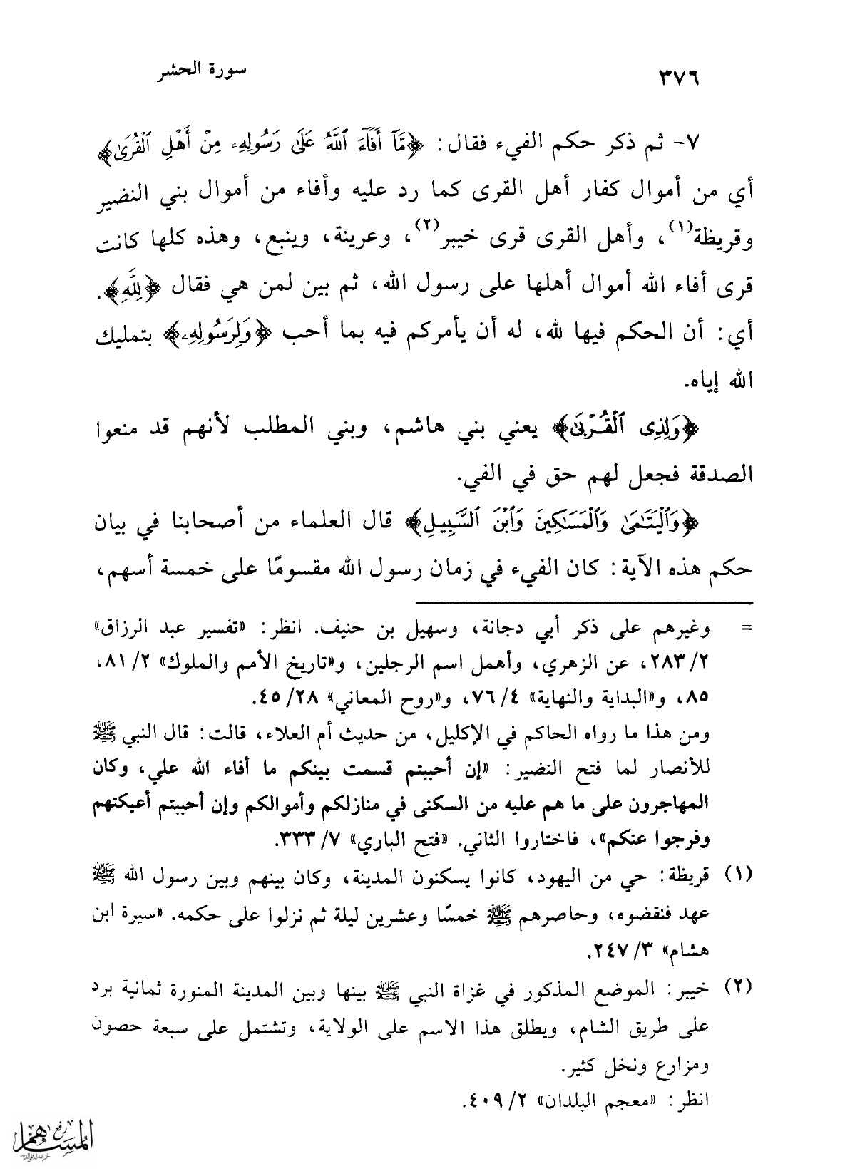 7 - ثم ذكر حكم الفيء فقال: {مَا أَفَاءَ اللَّهُ عَلَى رَسُولِهِ مِنْ أَهْلِ الْقُرَى} أي من أموال كفار أهل القرى كما رد عليه وأفاء من أموال بني النضير وقريظة (¬1)، وأهل القرى قرى خيبر (¬2)، وعرينة، وينبع، وهذه كلها كانت قرى أفاء الله أموال أهلها على رسول الله، ثم بين لمن هي فقال {لِلَّهِ}. أي: أن الحكم فيها لله، له أن يأمركم فيه بما أحب {وَلِرَسُولِهِ} بتمليك الله إياه.