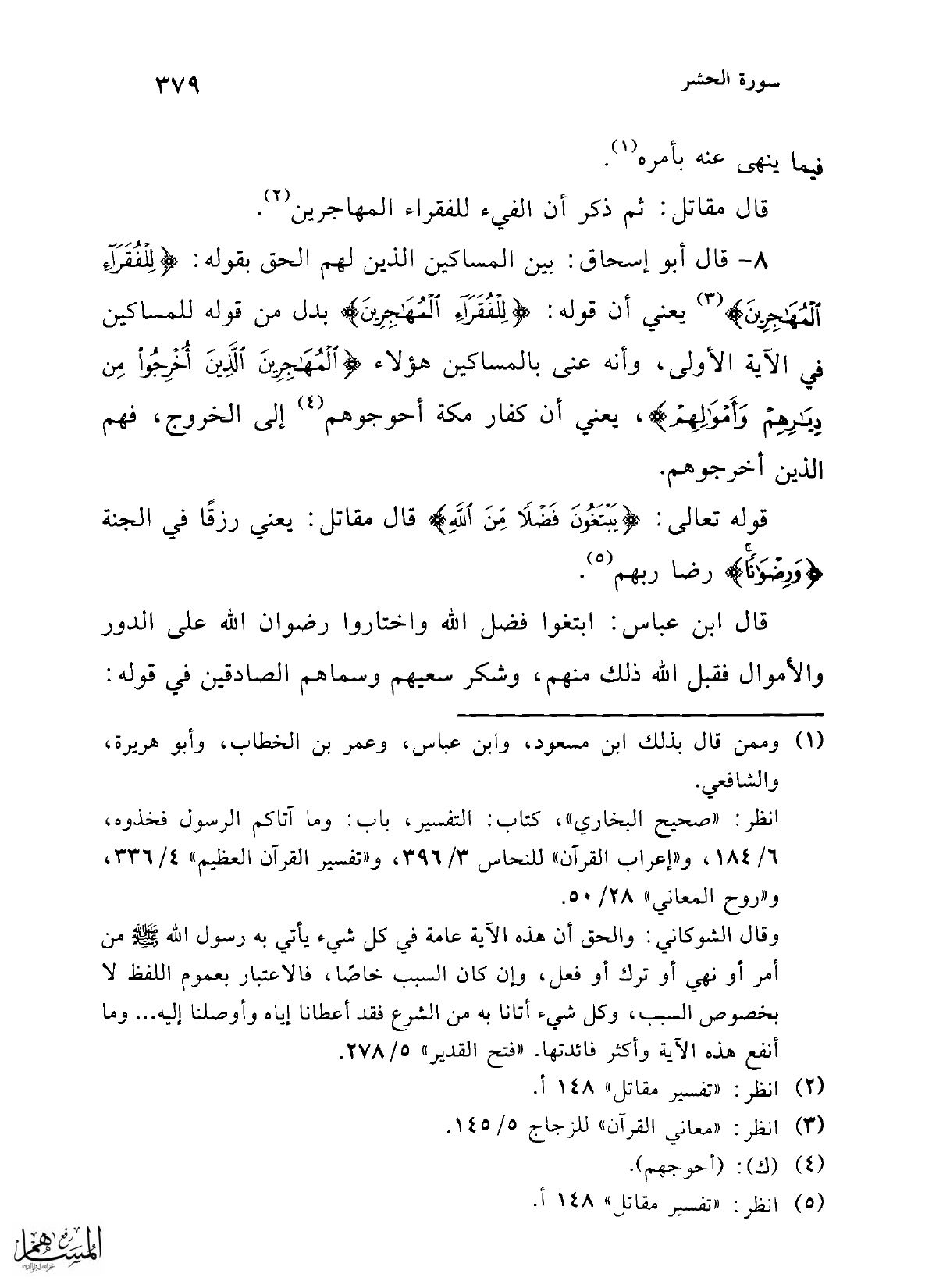 انظر: "صحيح البخاري"، كتاب: التفسير، باب: وما آتاكم الرسول فخذوه، 6/ 184، و"إعراب القرآن" للنحاس 3/ 396، و"تفسير القرآن العظيم" 4/ 336، و"روح المعاني" 28/ 50.