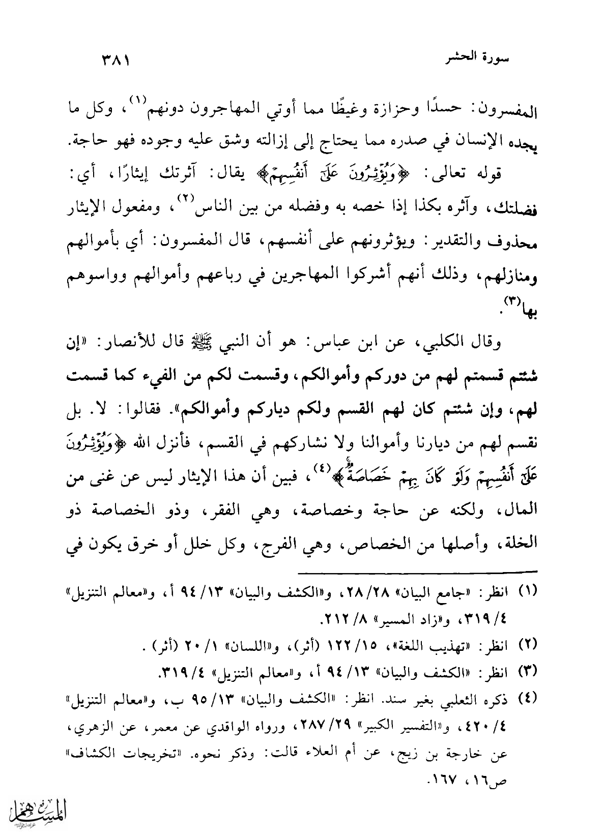 قوله تعالى: {وَيُؤْثِرُونَ عَلَى أَنْفُسِهِمْ} يقال: آثرتك إيثارًا، أي: فضلتك، وآثره بكذا إذا خصه به وفضله من بين الناس (¬2)، ومفعول الإيثار محذوف والتقدير: ويؤثرونهم على أنفسهم، قال المفسرون: أي بأموالهم ومنازلهم، وذلك أنهم أشركوا المهاجرين في رباعهم وأموالهم وواسوهم بها (¬3).