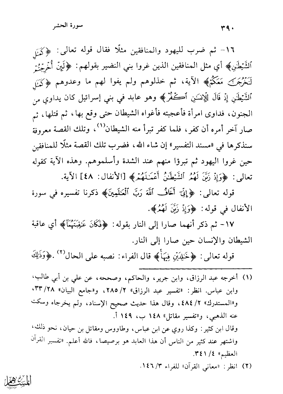 16 - ثم ضرب لليهود والمنافقين مثلًا فقال قولى تعالى: {كَمَثَلِ الشَّيْطَانِ} أي مثل المنافقين الذين غروا بني النضير بقولهم: {لَئِنْ أُخْرِجْتُمْ لَنَخْرُجَنَّ مَعَكُمْ} الآية، ثم خذلوهم ولم يفوا لهم ما وعدوهم {كَمَثَلِ الشَّيْطَانِ إِذْ قَالَ لِلْإِنْسَانِ اكْفُرْ} وهو عابد في بني إسرائيل كان يداوي من الجنون، فداوى امرأة فأعجبته فأغواه الشيطان حتى وقع بها، ثم قتلها، ثم صار آخر أمره أن كفر، فلما كفر تبرأ منه الشيطان (¬1)، وتلك القصة معروفة سنذكرها في "مسند التفسير" إن شاء الله، فضرب تلك القصة مثلاً للمنافقين حين غروا اليهود ثم تبرؤا منهم عند الشدة وأسلموهم. وهذه الآية كقوله تعالى: {وَإِذْ زَيَّنَ لَهُمُ الشَّيْطَانُ أَعْمَالَهُمْ} [الأنفال: 48] الآية.