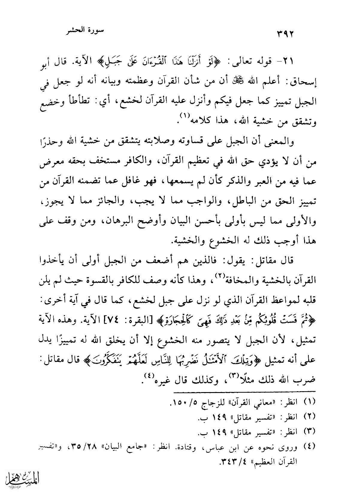 21 - قوله تعالى: {لَوْ أَنْزَلْنَا هَذَا الْقُرْآنَ عَلَى جَبَلٍ} الآية. قال أبو إسحاق: أعلم الله عز وجل أن من شأن القرآن وعظمته وبيانه أنه لو جعل في الجبل تمييز كما جعل فيكم وأنزل عليه القرآن لخشع، أي: تطأطأ وخضع وتشقق من خشية الله، هذا كلامه (¬1).