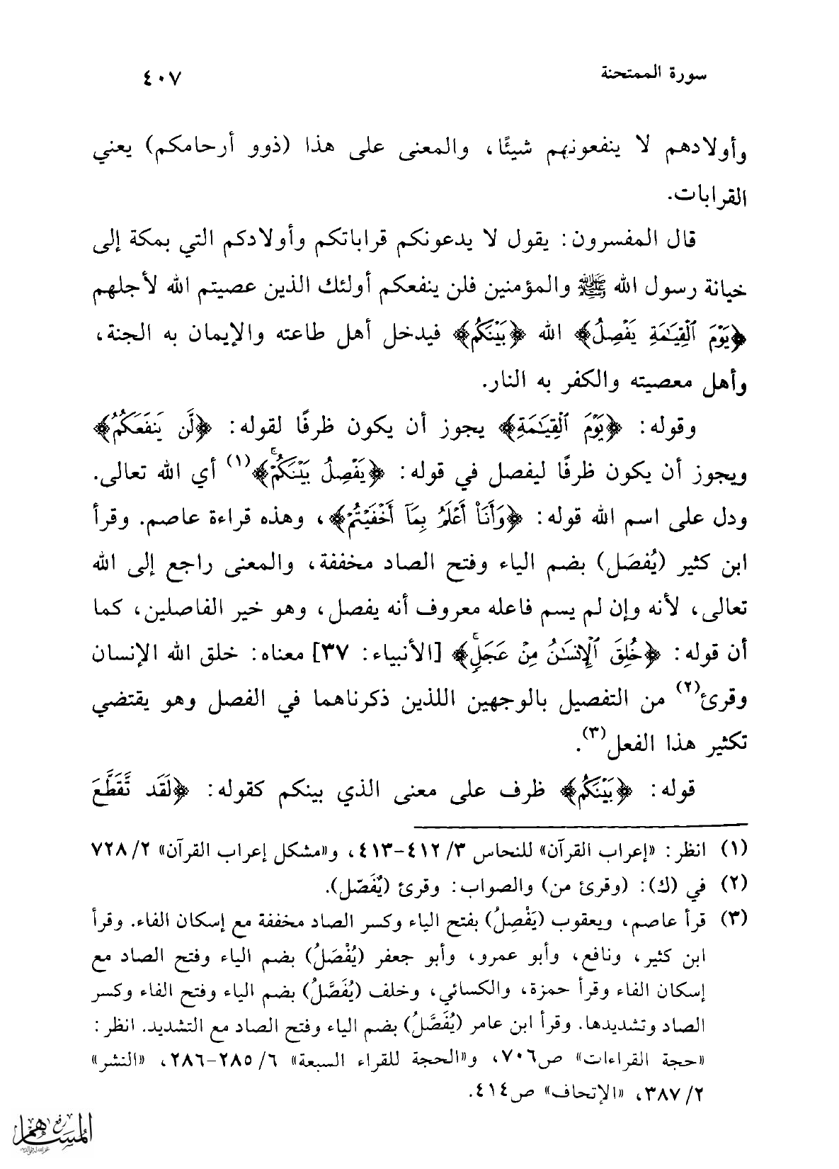 (¬3) قرأ عاصم، ويعقوب (يَفْصِلُ) بفتح الياء وكسر الصاد مخففة مع إسكان الفاء. وقرأ ابن كثير، ونافع، وأبو عمرو، وأبو جعفر (يُفْصَلُ) بضم الياء وفتح الصاد مع إسكان الفاء وقرأ حمزة، والكسائي، وخلف (يُفَصَّلُ) بضم الياء وفتح الفاء وكسر الصاد وتشديدها. وقرأ ابن عامر (يُفَصَّلُ) بضم الياء وفتح الصاد مع التشديد. انظر: "حجة القراءات" ص 706، و"الحجة للقراء السبعة" 6/ 285 - 286، "النشر" 2/ 387، "الإتحاف" ص 414.