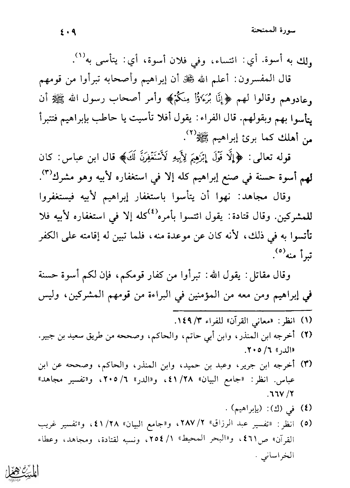 قال المفسرون: أعلم الله عز وجل أن إبراهيم وأصحابه تبرأوا من قومهم وعادوهم وقالوا لهم {إِنَّا بُرَآءُ مِنْكُمْ} وأمر أصحاب رسول الله -صلى الله عليه وسلم- أن يتأسوا بهم وبقولهم. قال الفراء: يقول أفلا تأسيت يا حاطب بإبراهيم فتتبرأ من أهلك كما برئ إبراهيم -صلى الله عليه وسلم- (¬2).