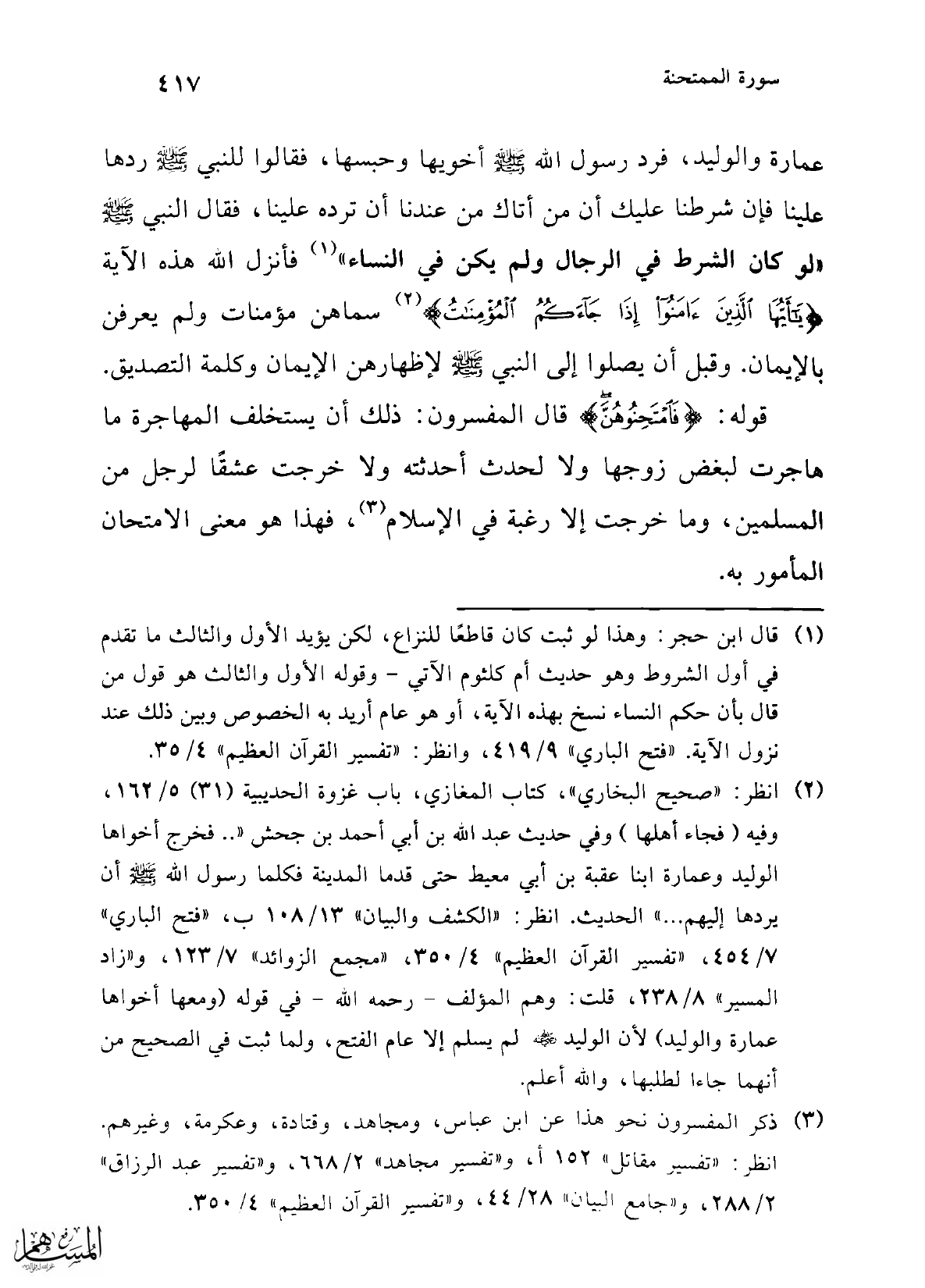 (¬2) انظر: "صحيح البخاري"، كتاب المغازي، باب غزوة الحديبية (31) 5/ 162، وفيه (فجاء أهلها) وفي حديث عبد الله بن أبي أحمد بن جحش " .. فخرج أخواها الوليد وعمارة ابنا عقبة بن أبي معيط حتى قدما المدينة فكلما رسول الله -صلى الله عليه وسلم- أن يردها إليهم ... " الحديث. انظر: "الكشف والبيان" 13/ 108 ب، "فتح الباري" 7/ 454، "تفسير القرآن العظيم" 4/ 350، "مجمع الزوائد" 7/ 123، و"زاد المسير" 8/ 238، قلت: وهم المؤلف -رحمه الله- في قوله (ومعها أخواها عمارة والوليد) لأن الوليد -رضي الله عنه- لم يسلم إلا عام الفتح، ولما ثبت في الصحيح من أنهما جاءا لطلبها، والله أعلم.