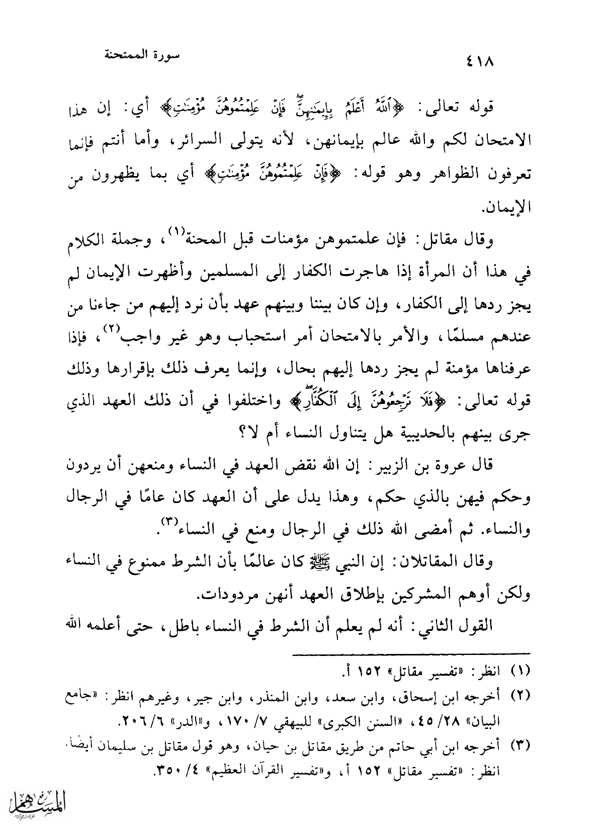 وقال مقاتل: فإن علمتموهن مؤمنات قبل المحنة (¬1)، وجملة الكلام في هذا أن المرأة إذا هاجرت الكفار إلى المسلمين وأظهرت الإيمان لم يجز ردها إلى الكفار، وإن كان بيننا وبينهم عهد بأن نرد إليهم من جاءنا من عندهم مسلمًا، والأمر بالامتحان أمر استحباب وهو غير واجب (¬2)، فإذا عرفناها مؤمنة لم يجز ردها إليهم بحال، وإنما يعرف ذلك بإقرارها وذلك قوله تعالى: {فَلَا تَرْجِعُوهُنَّ إِلَى الْكُفَّارِ} واختلفوا في أن ذلك العهد الذي جرى بينهم بالحديبية هل يتناول النساء أم لا؟