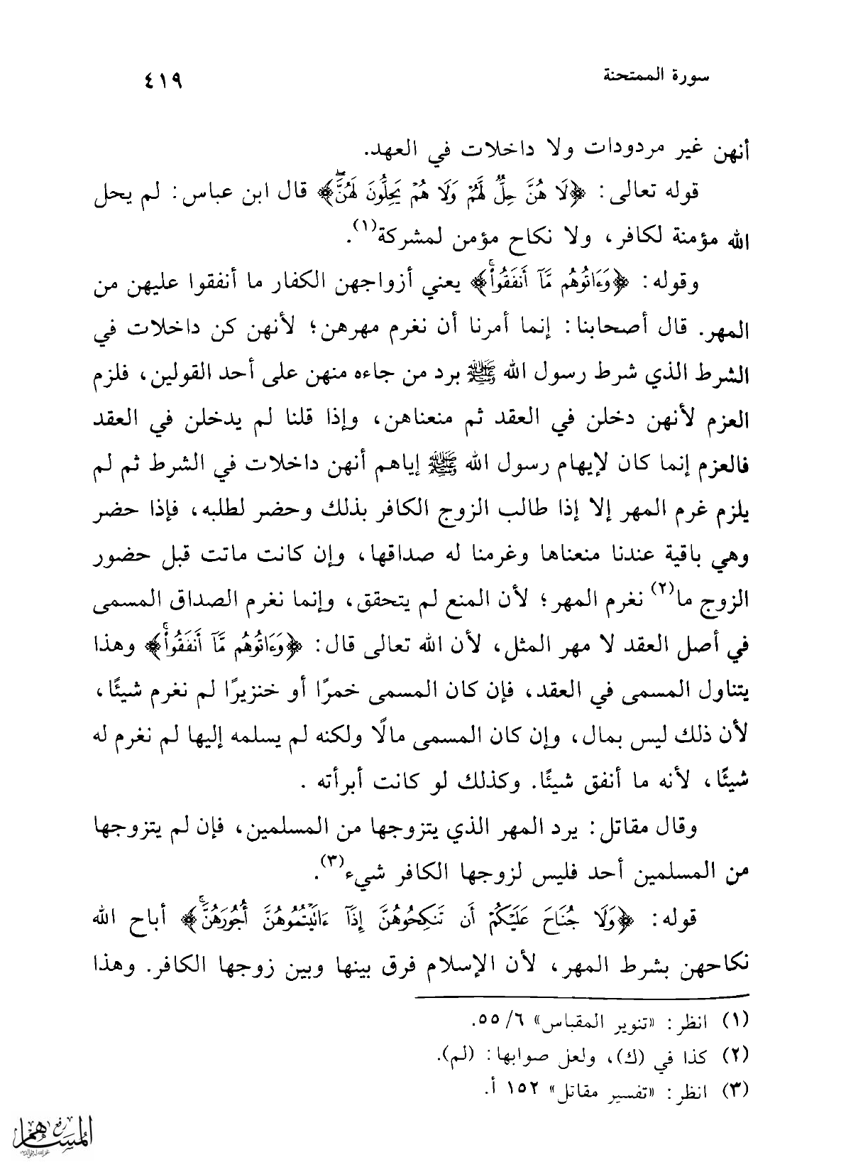 وقال مقاتل: يرد المهر الذي يتزوجها من المسلمين، فإن لم يتزوجها من المسلمين أحد فليس لزوجها الكافر شيء (¬3).
