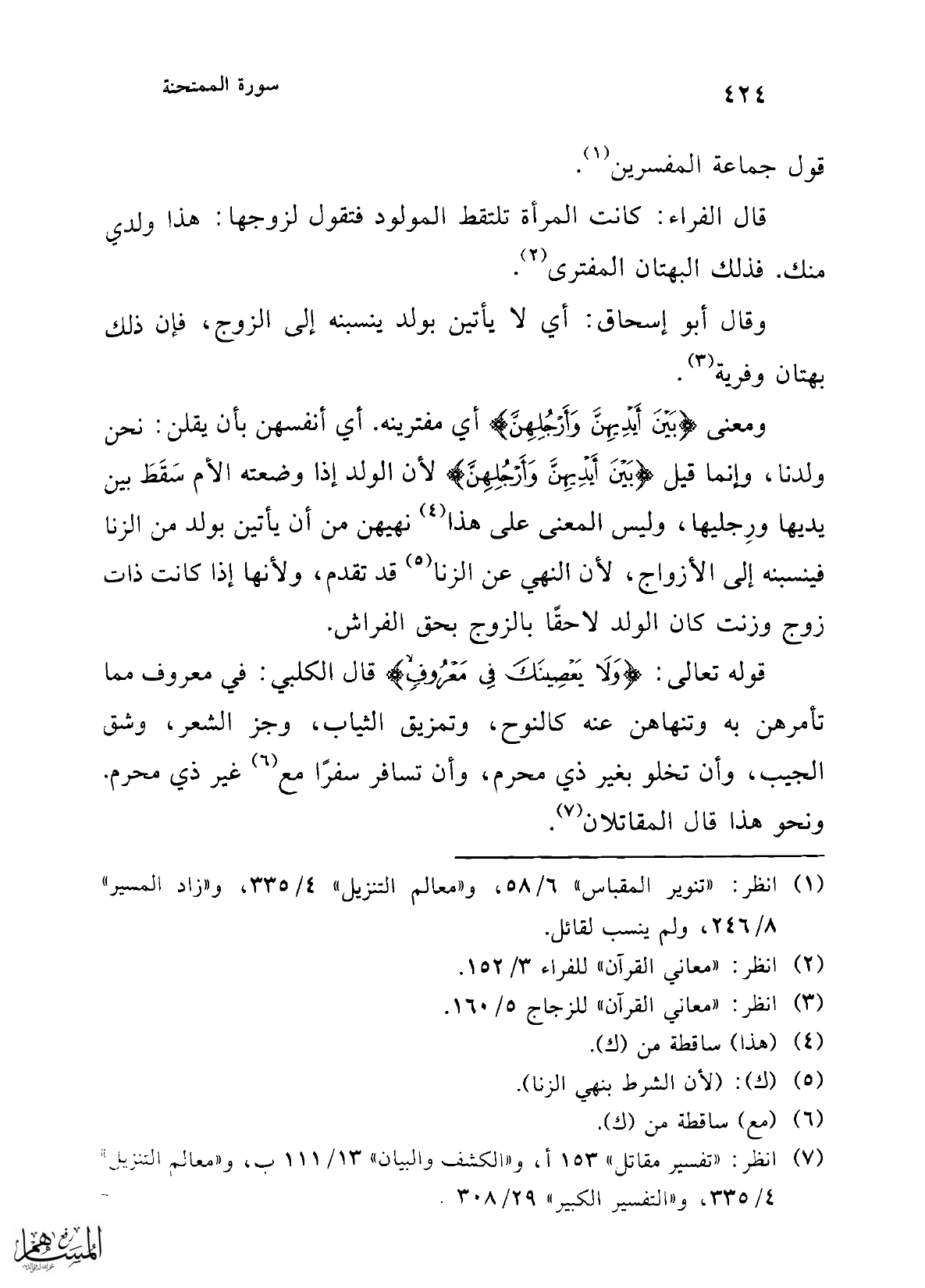 ومعنى {بَيْنَ أَيْدِيهِنَّ وَأَرْجُلِهِنَّ} أي مفترينه. أي أنفسهن بأن يقلن: نحن ولدنا، وإنما قيل {بَيْنَ أَيْدِيهِنَّ وَأَرْجُلِهِنَّ} لأن الولد إذا وضعته الأم سَقَطَ بين يديها ورِجليها, وليس المعنى على هذا (¬4) نهيهن من أن يأتين بولد من الزنا فينسبنه إلى الأزواج؛ لأن النهي عن الزنا (¬5) قد تقدم، ولأنها إذا كانت ذات زوج وزنت كان الولد لاحقًا بالزوج بحق الفراش.