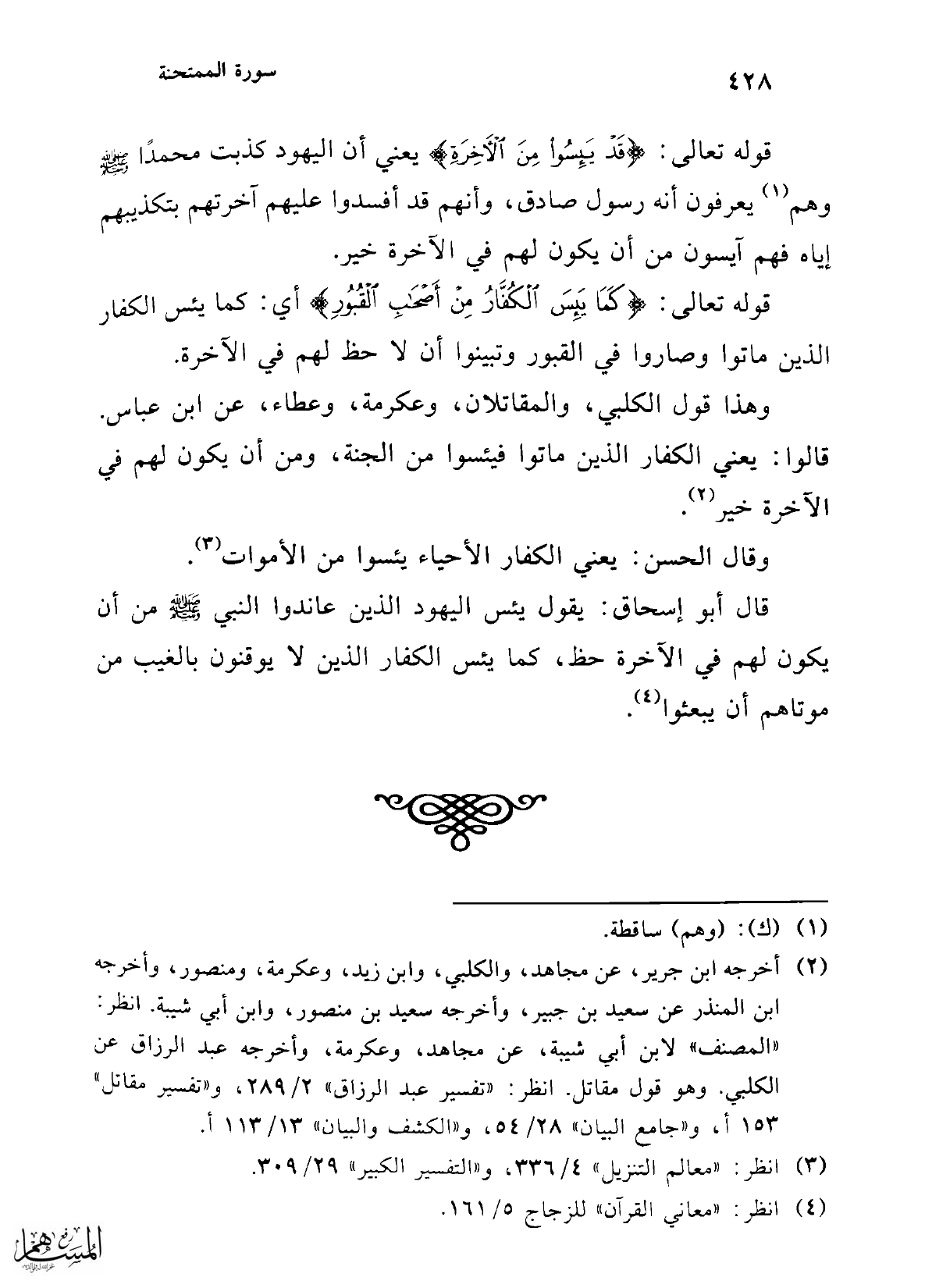 (¬2) أخرجه ابن جرير، عن مجاهد، والكلبي، وابن زيد، وعكرمة، ومنصور، وأخرجه ابن المنذر عن سعيد بن جبير، وأخرجه سعيد بن منصور، وابن أبي شيبة. انظر: "المصنف" لابن أبي شيبة، عن مجاهد، وعكرمة، وأخرجه عبد الرزاق عن الكلبي. وهو قول مقاتل. انظر: "تفسير عبد الرزاق" 2/ 289، و"تفسير مقاتل" 153 أ، و"جامع البيان" 28/ 54، و"الكشف والبيان" 13/ 113 أ.