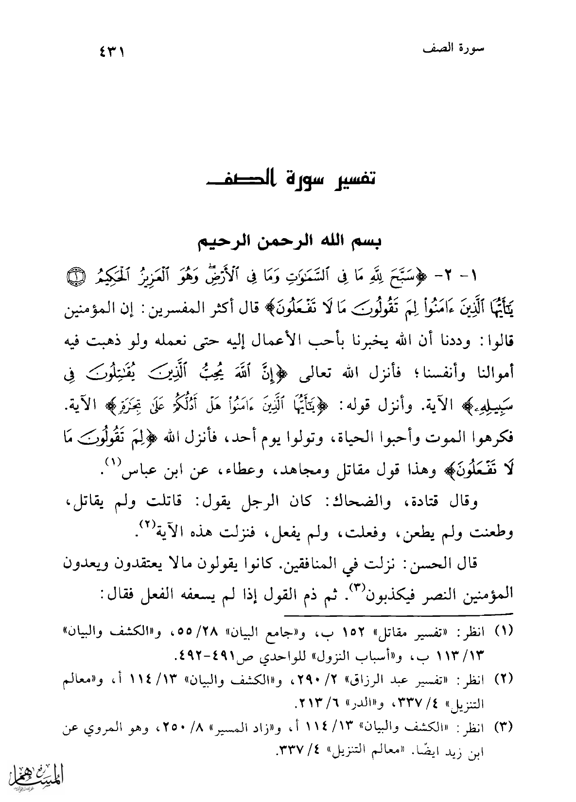 1، 2 - {سَبَّحَ لِلَّهِ مَا فِي السَّمَاوَاتِ وَمَا فِي الْأَرْضِ وَهُوَ الْعَزِيزُ الْحَكِيمُ (1) يَا أَيُّهَا الَّذِينَ آمَنُوا لِمَ تَقُولُونَ مَا لَا تَفْعَلُونَ} قال أكثر المفسرين: إن المؤمنين قالوا: وددنا أن الله يخبرنا بأحب الأعمال إليه حتى نعمله ولو ذهبت فيه أموالنا وأنفسنا؛ فأنزل الله تعالى {إِنَّ اللَّهَ يُحِبُّ الَّذِينَ يُقَاتِلُونَ فِي سَبِيلِهِ} الآية. وأنزل قوله: {أَيُّهَا الَّذِينَ آمَنُوا هَلْ أَدُلُّكُمْ عَلَى تِجَارَةٍ} الآية. فكرهوا الموت وأحبوا الحياة، وتولوا يوم أحد، فأنزل الله {لِمَ تَقُولُونَ مَا لَا تَفْعَلُونَ} وهذا قول مقاتل ومجاهد، وعطاء، عن ابن عباس (1).