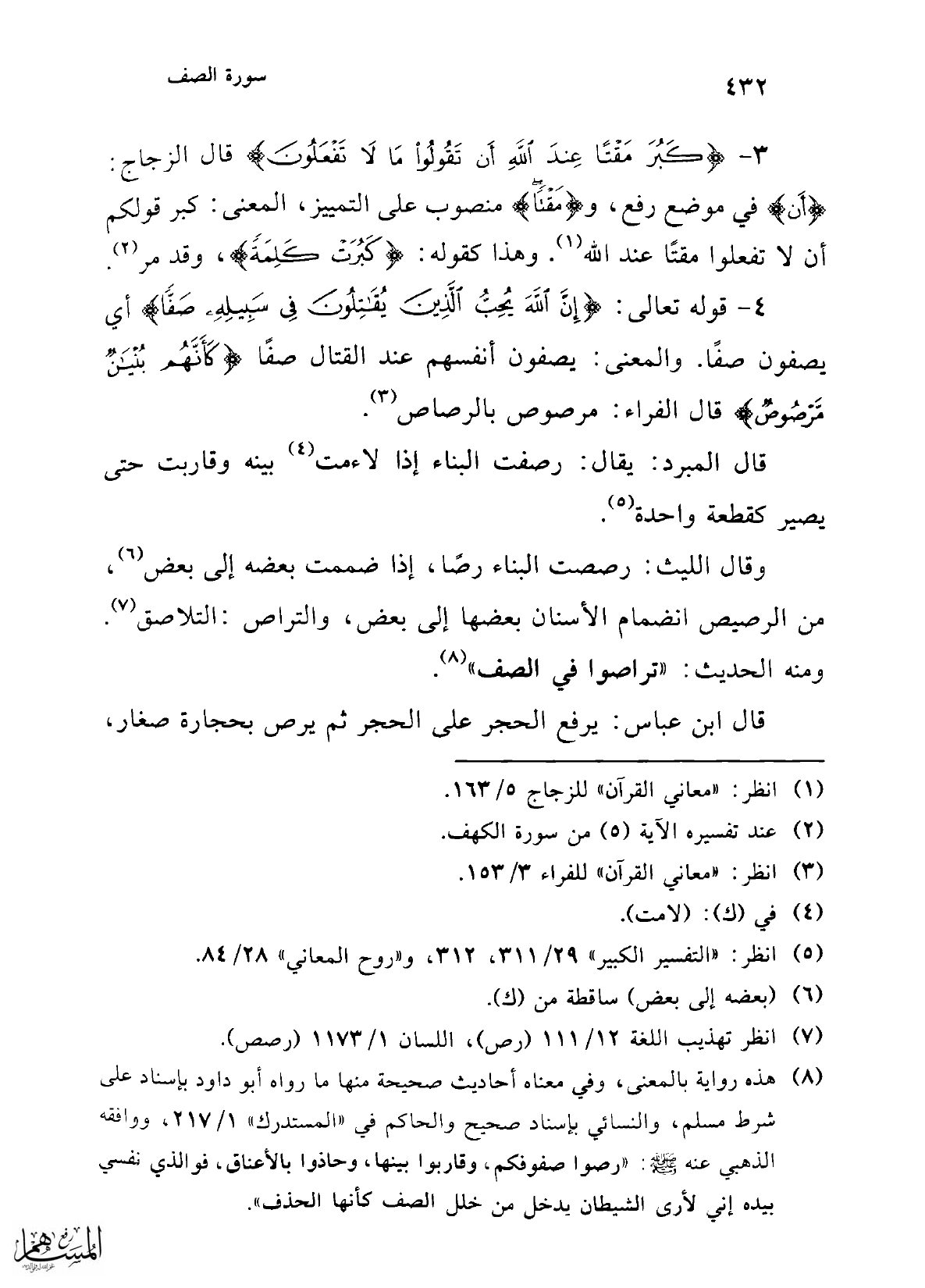 4 - قوله تعالى: {إِنَّ اللَّهَ يُحِبُّ الَّذِينَ يُقَاتِلُونَ فِي سَبِيلِهِ صَفًّا} أي يصفون صفًا. والمعنى: يصفون أنفسهم عند القتال صفًا {كَأَنَّهُمْ بُنْيَانٌ مَرْصُوصٌ} قال الفراء: مرصوص بالرصاص (¬3).