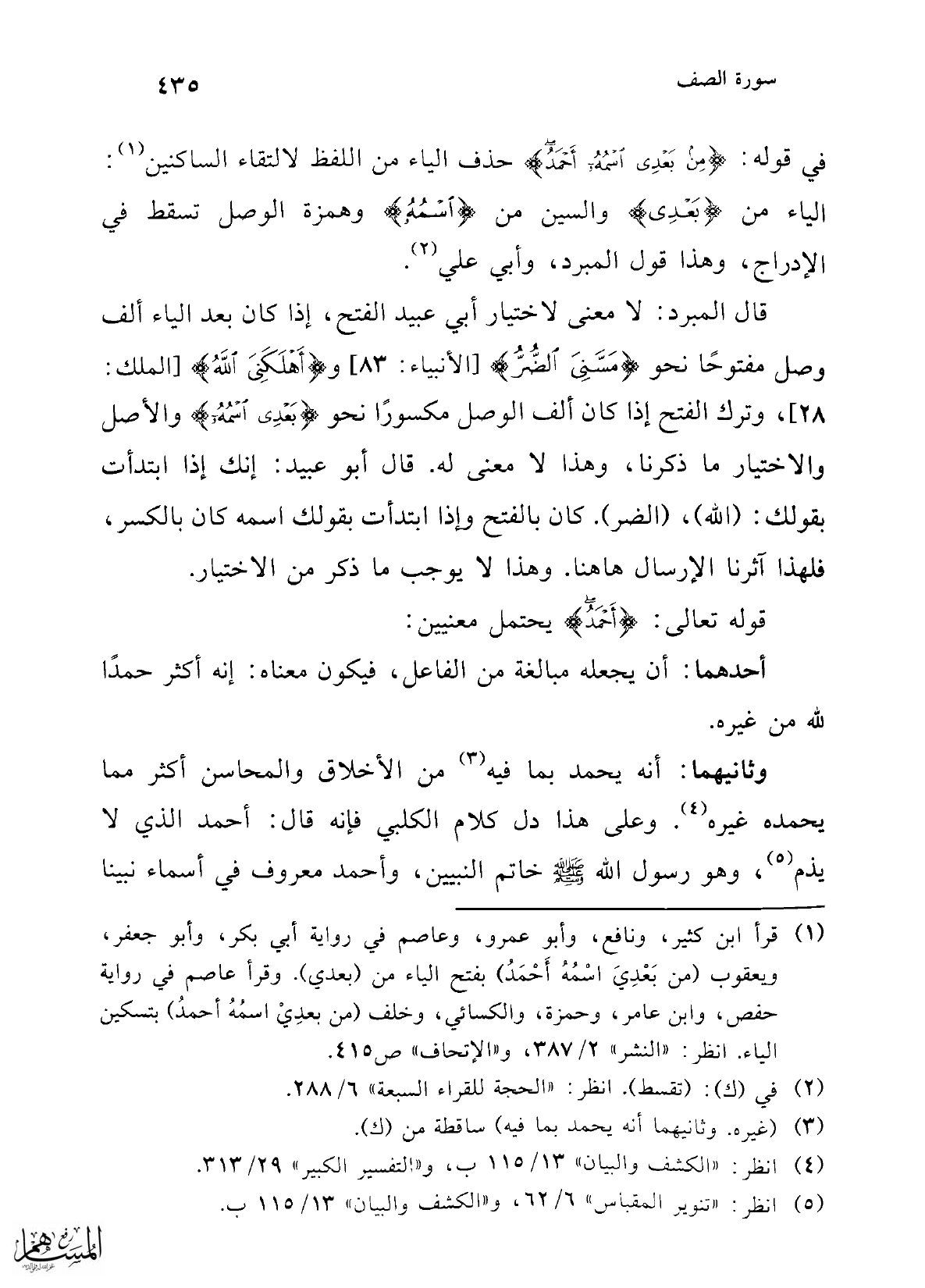 في قوله: {مِنْ بَعْدِي اسْمُهُ أَحْمَدُ} حذف الياء من اللفظ لالتقاء الساكنين (¬1): الياء من {بَعْدِي} والسين من {اسْمُهُ} وهمزة الوصل تسقط في الإدراج، وهذا قول المبرد، وأبي علي (¬2).