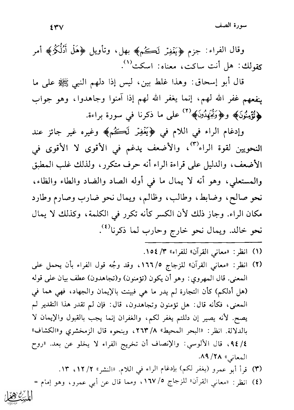 وقال الفراء: جزم {يَغْفِرْ لَكُمْ} بهل، وتأويل {هَلْ أَدُلُّكُمْ} أمر كقولك: هل أنت ساكت، معناه: اسكت (¬1).