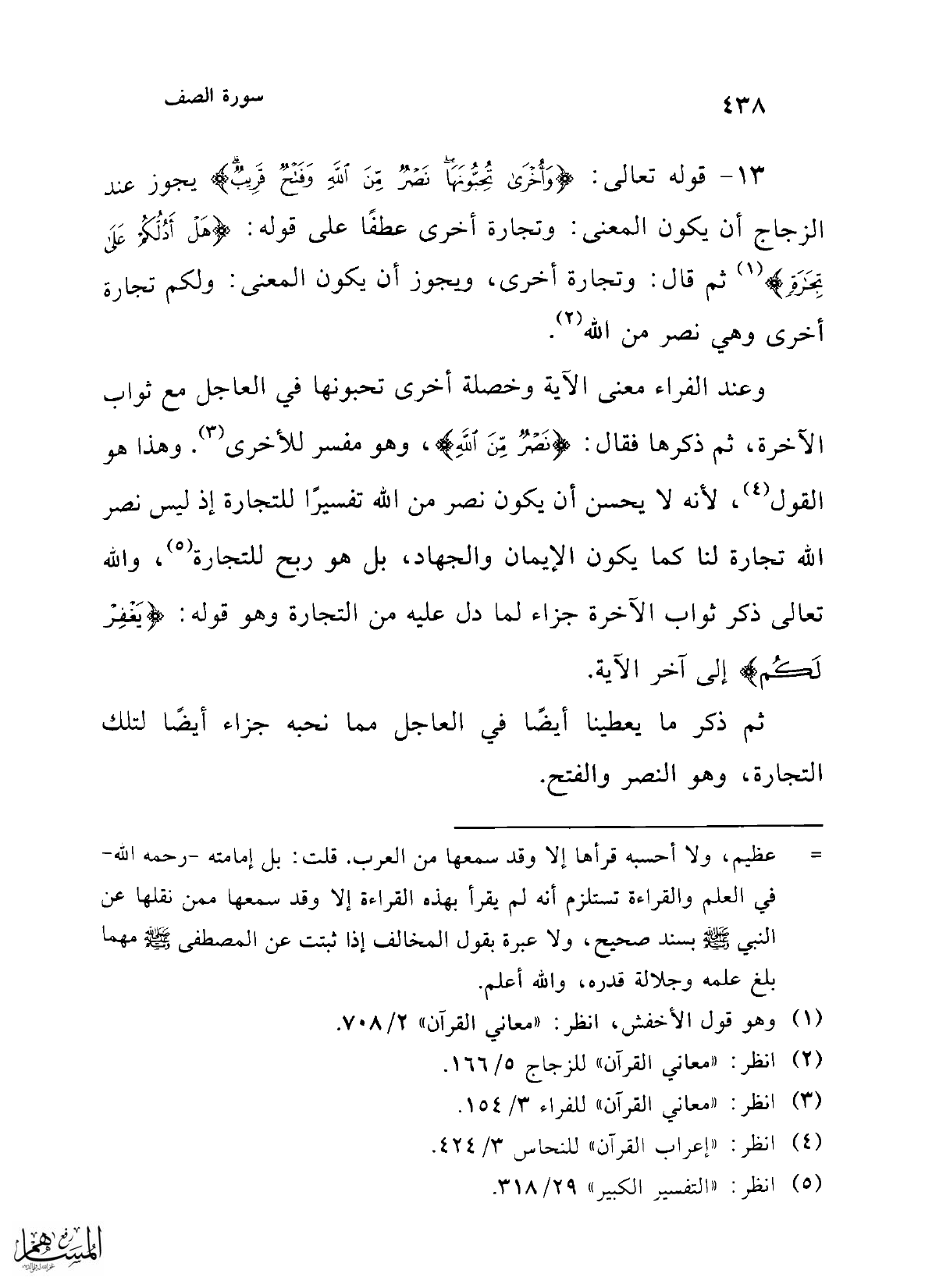 13 - قوله تعالى: {وَأُخْرَى تُحِبُّونَهَا نَصْرٌ مِنَ اللَّهِ وَفَتْحٌ قَرِيبٌ} يجوز عند الزجاج أن يكون المعنى: وتجارة أخرى عطفًا على قوله: {هَلْ أَدُلُّكُمْ عَلَى تِجَارَةٍ} (¬1) ثم قال: وتجارة أخرى، ويجوز أن يكون المعنى: ولكم تجارة أخرى وهي نصر من الله (¬2).