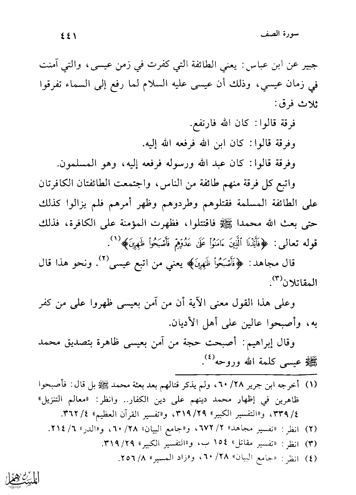 واتبع كل فرقة منهم طائفة من الناس، واجتمعت الطائفتان الكافرتان على الطائفة المسلمة فقتلوهم وطردوهم وظهر أمرهم فلم يزالوا كذلك حتى بعث الله محمدا -صلى الله عليه وسلم- فاقتتلوا، فظهرت المؤمنة على الكافرة، فذلك قوله تعالى: {فَأَيَّدْنَا الَّذِينَ آمَنُوا عَلَى عَدُوِّهِمْ فَأَصْبَحُوا ظَاهِرِينَ} (¬1).