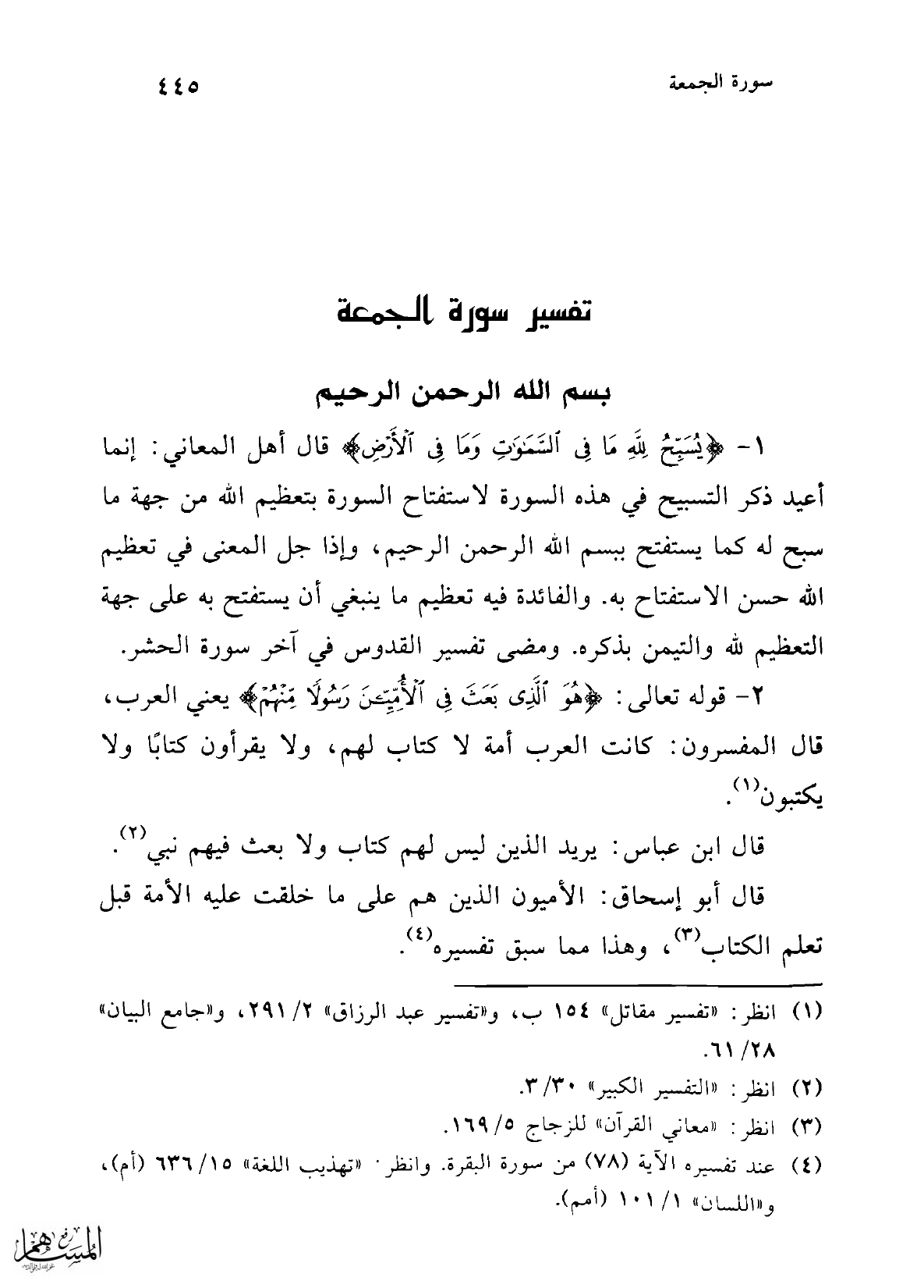 2 - قوله تعالى: {هُوَ الَّذِي بَعَثَ فِي الْأُمِّيِّينَ رَسُولًا مِنْهُمْ} يعني العرب، قال المفسرون: كانت العرب أمة لا كتاب لهم، ولا يقرأون كتابًا ولا يكتبون (¬1).