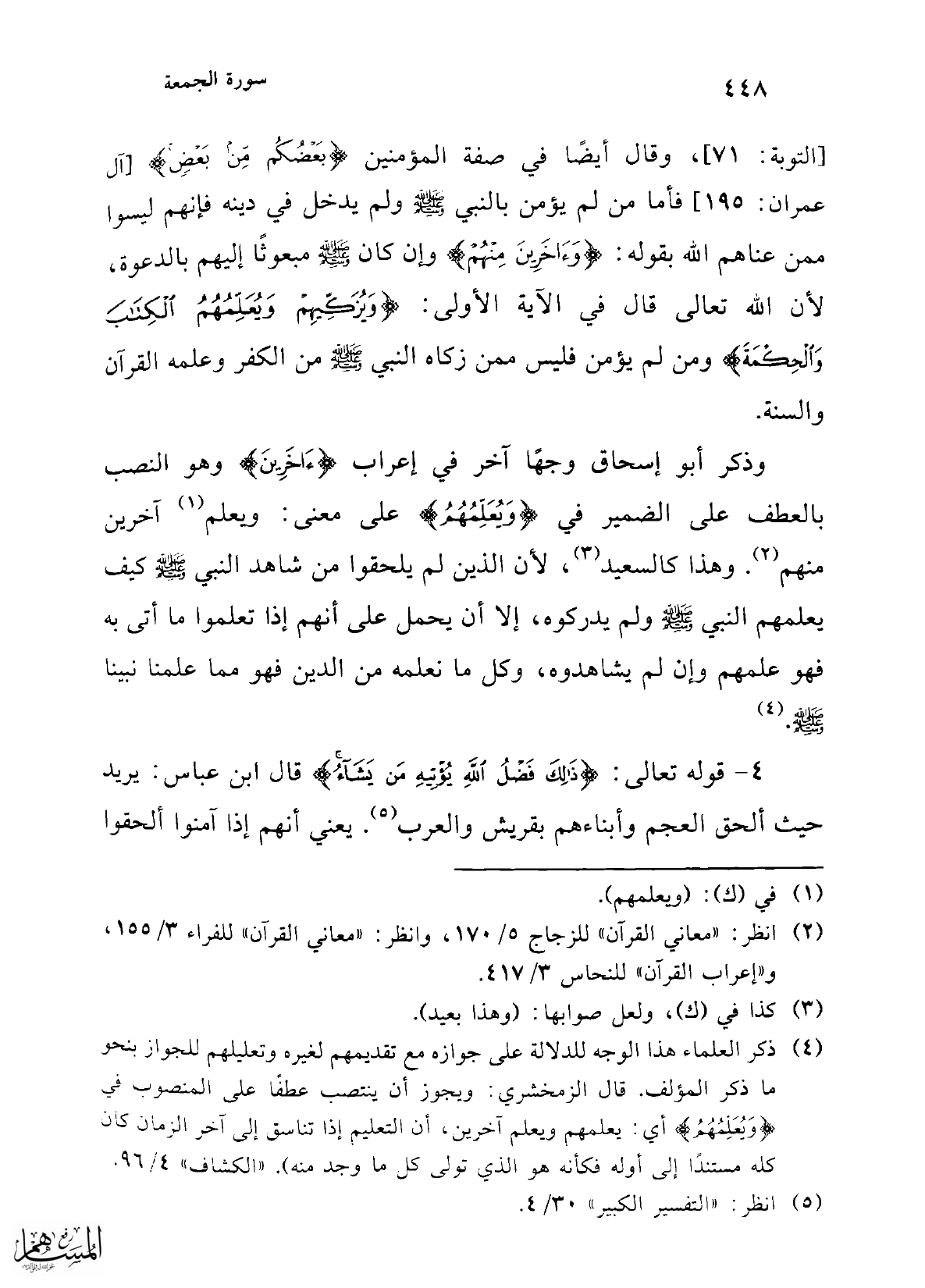 (¬4) ذكر العلماء هذا الوجه للدلالة على جوازه مع تقديمهم لغيره وتعليلهم للجواز بنحو ما ذكر المؤلف. قال الزمخشري: ويجوز أن ينتصب عطفًا على المنصوب في {وَيُعَلِّمُهُمُ} أي: يعلمهم ويعلم آخرين، أن التعليم إذا تناسق إلى آخر الزمان كان كله مستندًا إلى أوله فكأنه هو الذي تولى كل ما وجد منه). "الكشاف" 4/ 96.