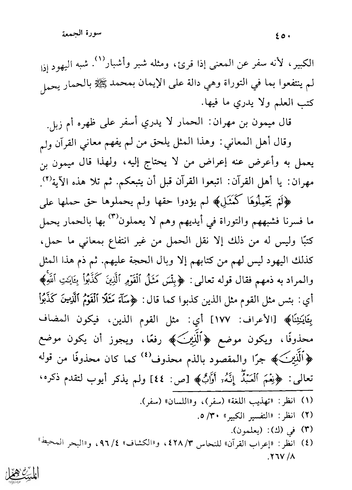 الكبير، لأنه سفر عن المعنى إذا قرئ، ومثله شبر وأشبار (¬1). شبه اليهود إذا لم ينتفعوا بما في التوراة وهي دالة على الإيمان بمحمد -صلى الله عليه وسلم- بالحمار يحمل كتب العلم ولا يدري ما فيها.