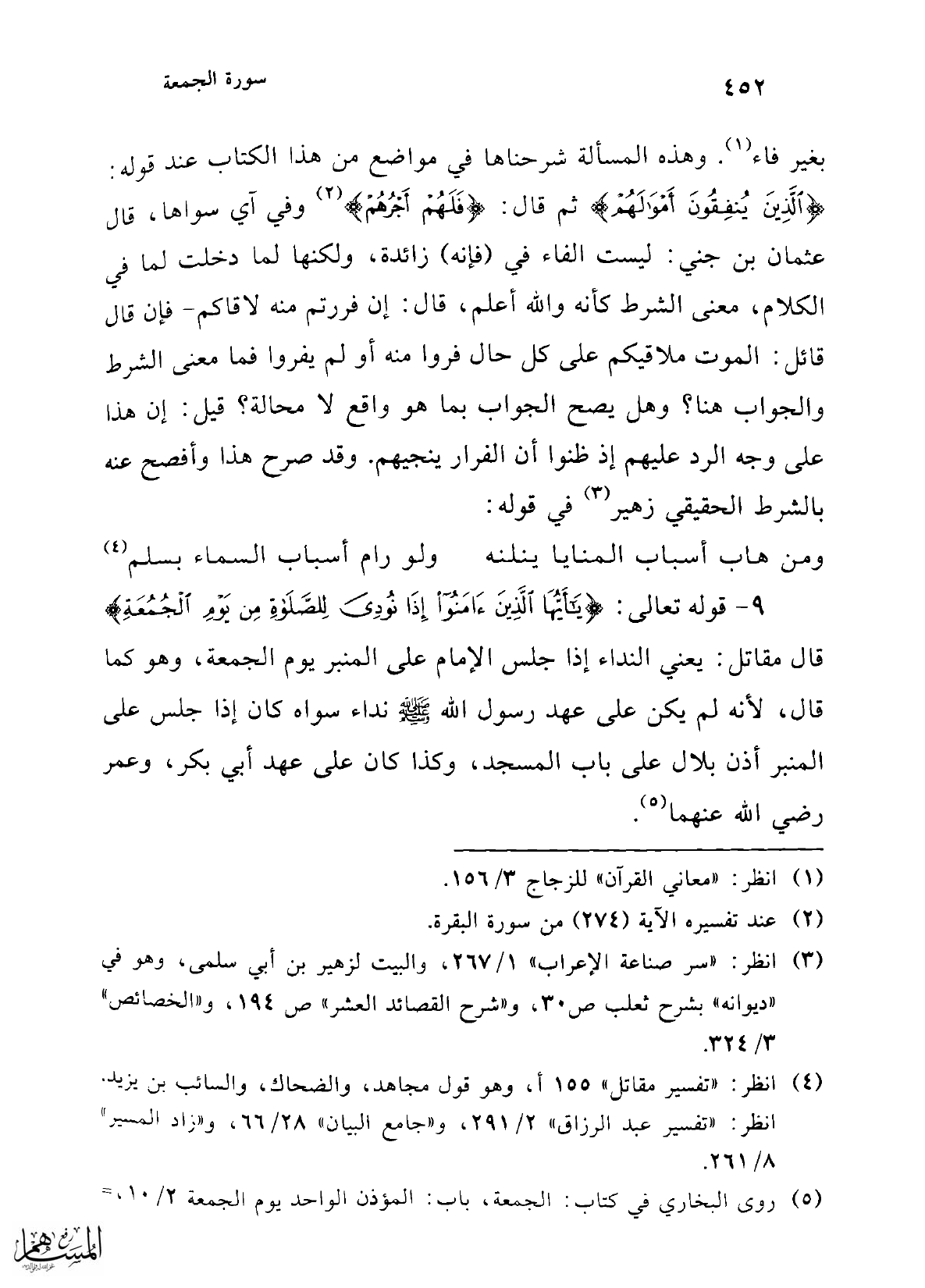 9 - قوله تعالى: {يَا أَيُّهَا الَّذِينَ آمَنُوا إِذَا نُودِيَ لِلصَّلَاةِ مِنْ يَوْمِ الْجُمُعَةِ} قال مقاتل: يعني النداء إذا جلس الإمام على المنبر يوم الجمعة، وهو كما قال، لأنه لم يكن على عهد رسول الله -صلى الله عليه وسلم- نداء سواه كان إذا جلس على المنبر أذن بلال على باب المسجد، وكذا كان على عهد أبي بكر، وعمر رضي الله عنهما (¬5).