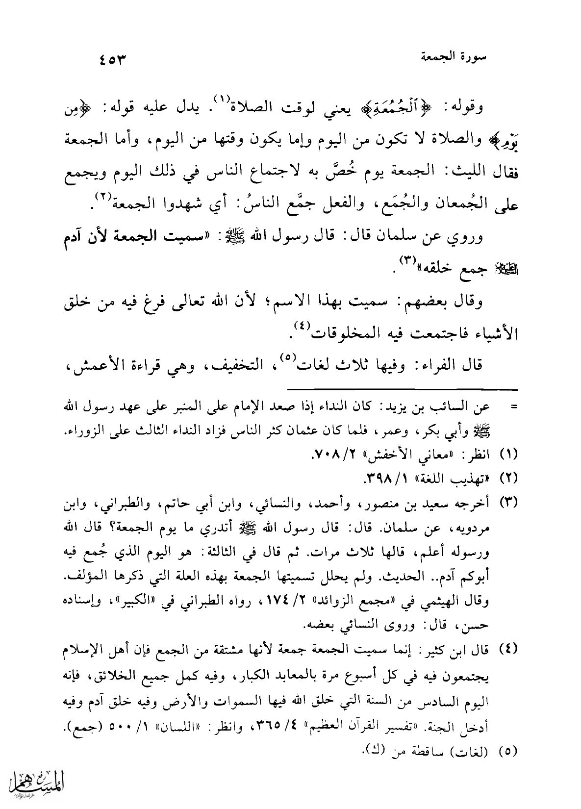 وقوله: {الْجُمُعَةِ} يعني لوقت الصلاة (¬1). يدل عليه قوله: {مِنْ يَوْمِ} والصلاة لا تكون من اليوم وإما يكون وقتها من اليوم، وأما الجمعة فقال الليث: الجمعة يوم خُصَّ به لاجتماع الناس في ذلك اليوم ويجمع على الجُمعان والجُمَع، والفعل جمَّع الناسُ: أي شهدوا الجمعة (¬2).