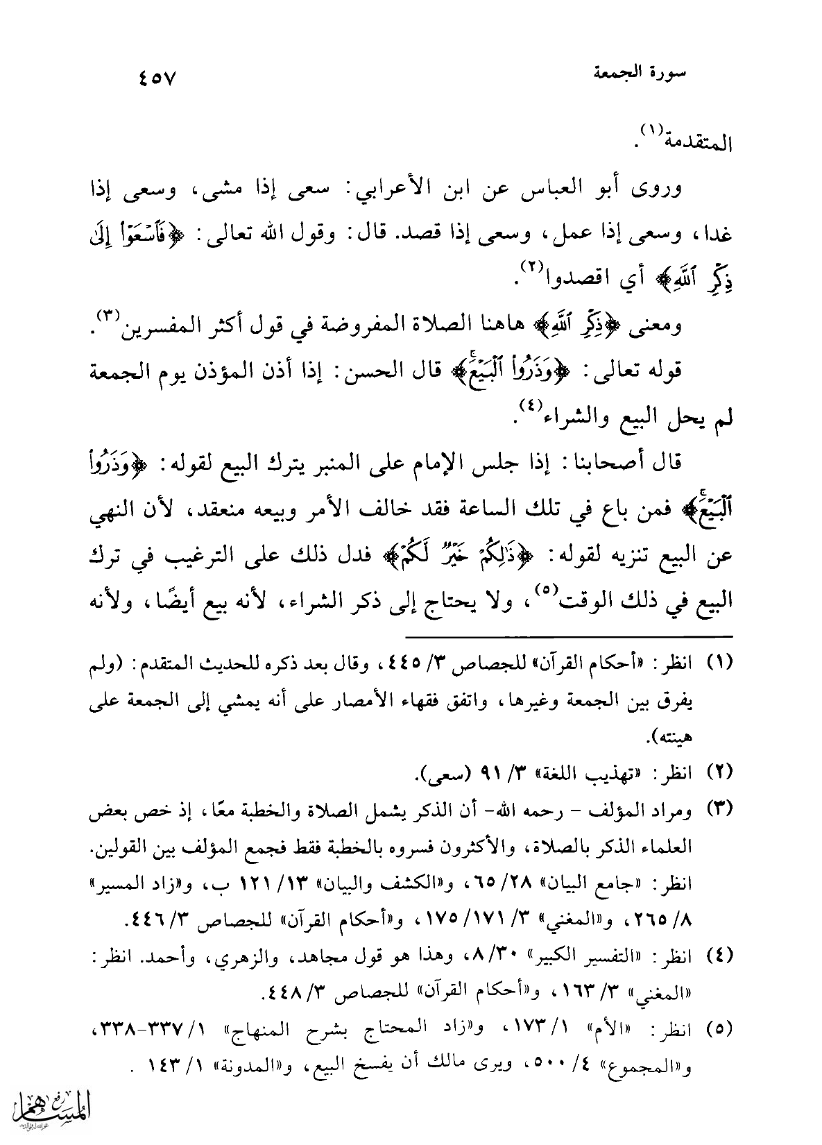 (¬3) ومراد المؤلف -رحمه الله- أن الذكر يشمل الصلاة والخطبة معًا، إذ خص بعض العلماء الذكر بالصلاة، والأكثرون فسروه بالخطبة فقط فجمع المؤلف بين القولين. انظر: "جامع البيان" 28/ 65، و"الكشف والبيان" 13/ 121 ب، و"زاد المسير" 8/ 265، و"المغني" 3/ 171/ 175، و"أحكام القرآن" للجصاص 3/ 446.