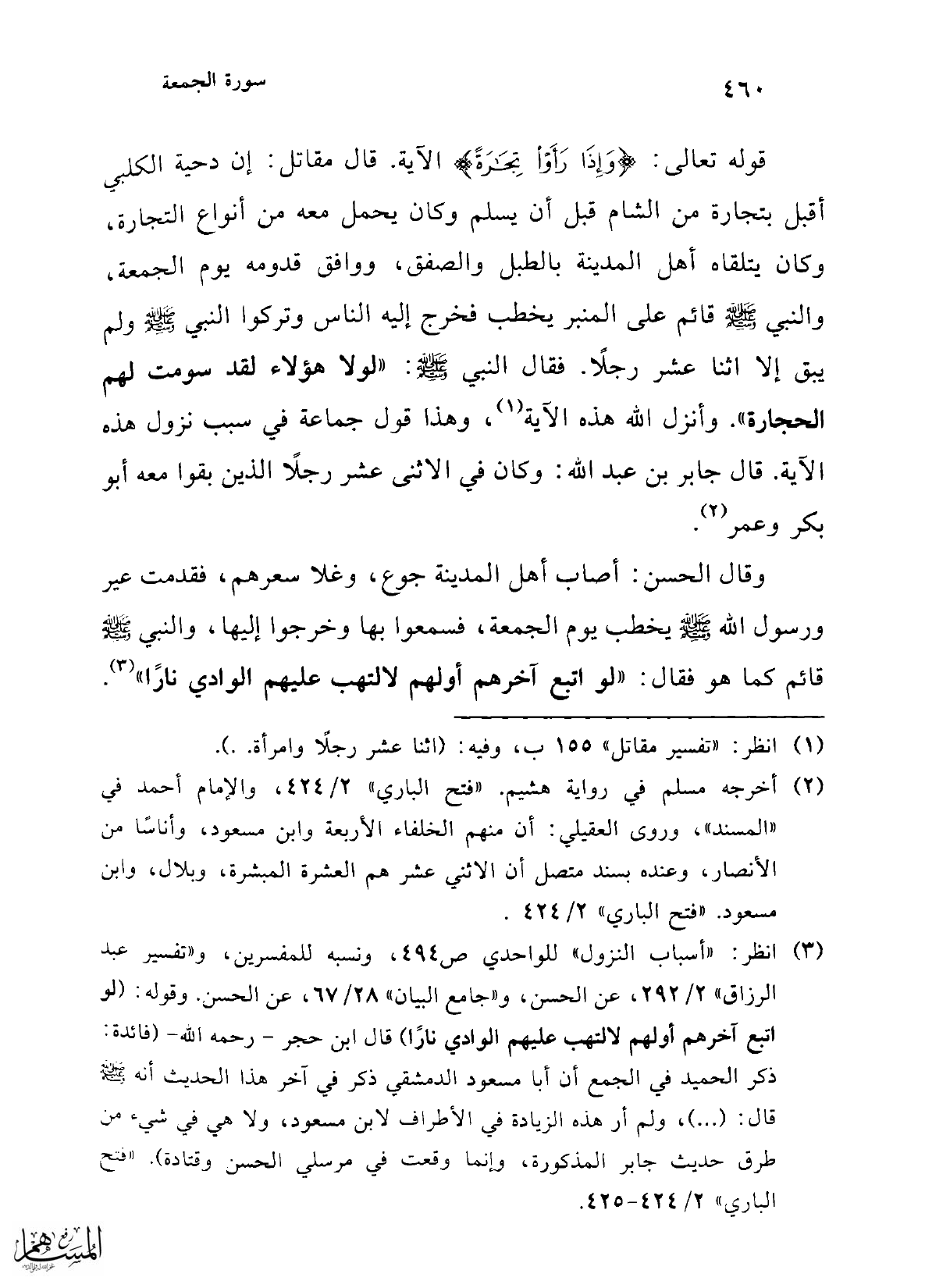 (¬3) انظر: "أسباب النزول" للواحدي ص 494، ونسبه للمفسرين، و"تفسير عبد الرزاق" 2/ 292، عن الحسن، و"جامع البيان" 28/ 67، عن الحسن. وقوله: (لو اتبع آخرهم أولهم لالتهب علبهم الوادي نارًا) قال ابن حجر -رحمه الله- (فائدة: ذكر الحميد في الجمع أن أبا مسعود الدمشقي ذكر في آخر هذا الحديث أنه -صلى الله عليه وسلم- قال: (...)، ولم أر هذه الزيادة في الأطراف لابن مسعود، ولا هي في شيء من طرق حديث جابر المذكورة، وإنما وقعت في مرسلي الحسن وقتادة) "فتح البارى" 2/ 424 - 425.