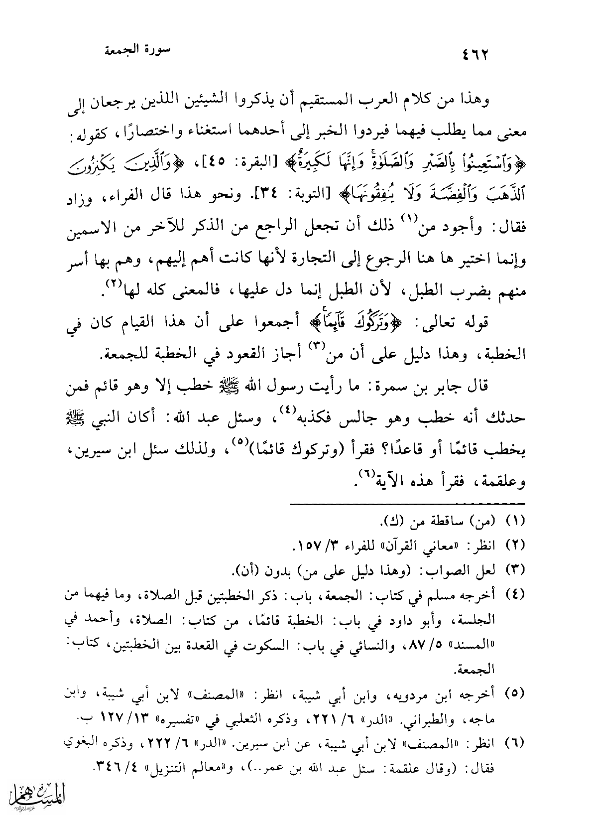 وهذا من كلام العرب المستقيم أن يذكروا الشيئين اللذين يرجعان إلى معنى مما يطلب فيهما فيردوا الخبر إلى أحدهما استغناء واختصارًا، كقوله: {وَاسْتَعِينُوا بِالصَّبْرِ وَالصَّلَاةِ وَإِنَّهَا لَكَبِيرَةٌ} [البقرة: 45]، {وَالَّذِينَ يَكْنِزُونَ الذَّهَبَ وَالْفِضَّةَ وَلَا يُنْفِقُونَهَا} [التوبة: 34]. ونحو هذا قال الفراء، وزاد فقال: وأجود من (¬1) ذلك أن تجعل الراجع من الذكر للآخر من الاسمين وإنما اختير هاهنا الرجوع إلى التجارة لأنها كانت أهم إليهم، وهم بها أسر منهم بضرب الطبل، لأن الطبل إنما دل عليها، فالمعنى كله لها (¬2).