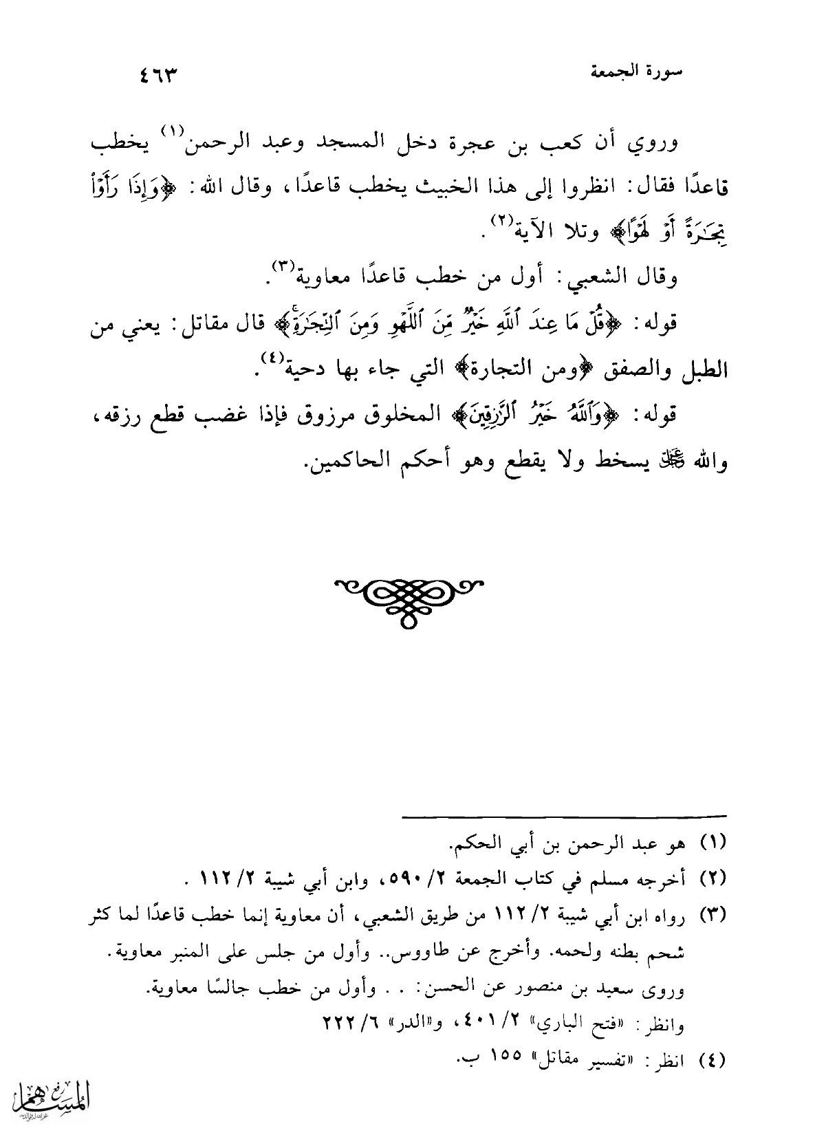 (¬3) رواه ابن أبي شيبة 2/ 112 من طريق الشعبي، أن معاوية إنما خطب قاعدًا لما كثر شحم بطنه ولحمه. وأخرج عن طاووس .. وأول من جلس على المنبر معاوية. وروى سعيد بن منصور عن الحسن: .. وأول من خطب جالسًا معاوية.