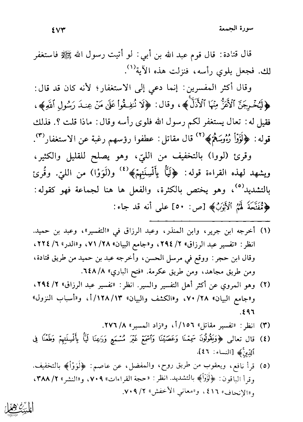 قال قتادة: قال قوم عبد الله بن أبي: لو أتيت رسول الله -صلى الله عليه وسلم- فاستغفر لك. فجعل يلوي رأسه، فنزلت هذه الآية (¬1).