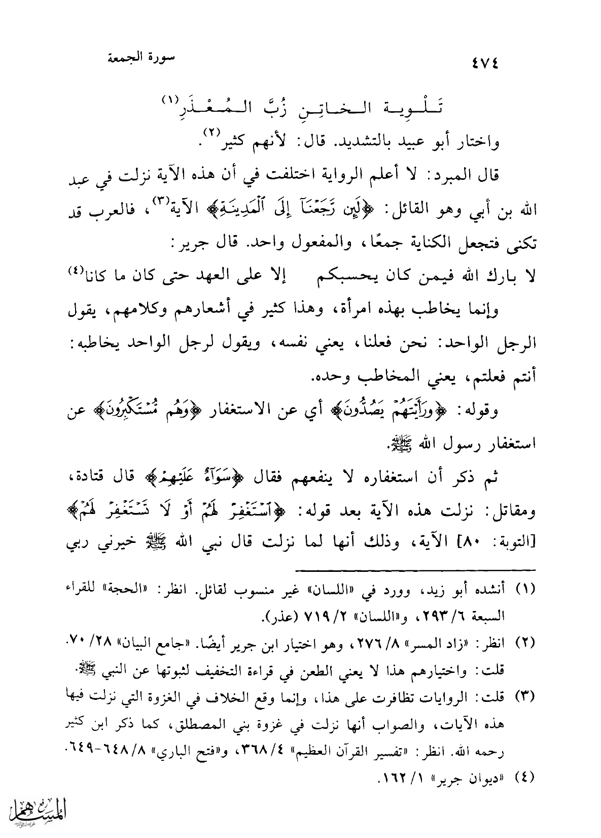 قال المبرد: لا أعلم الرواية اختلفت في أن هذه الآية نزلت في عبد الله بن أبي وهو القائل: {لَئِنْ رَجَعْنَا إِلَى الْمَدِينَةِ} الآية (¬3)، فالعرب قد تكنى فتجعل الكناية جمعًا، والمفعول واحد. قال جرير: