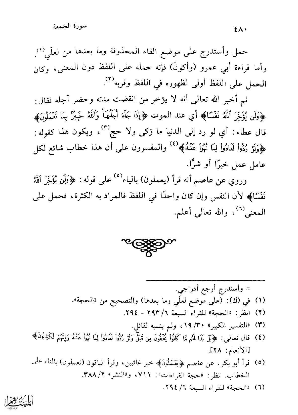 (¬6) "الحجة" للقراء السبعة 6/ 294.