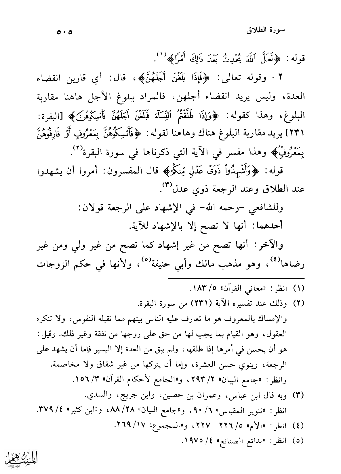 قوله: {وَأَشْهِدُوا ذَوَيْ عَدْلٍ مِنْكُمْ} قال المفسرون: أمروا أن يشهدوا عند الطلاق وعند الرجعة ذوي عدل (¬3).