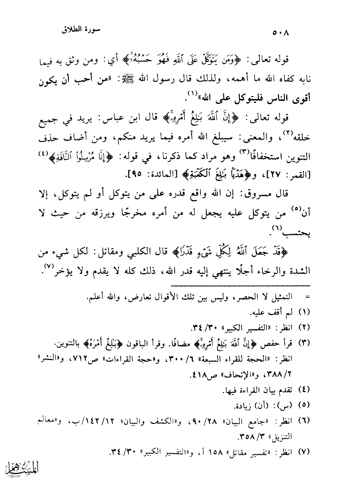 (¬3) قرأ حفص {إِنَّ اللهَ بَالِغُ أَمْرِهِ} مضافًا. وقرأ الباقون {بَالِغُ أَمْرِهِ} بالتنوين.