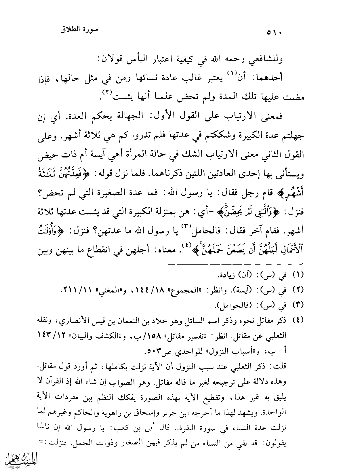 قلت: ذكر الثعلبي عند سبب النزول أن الآية نزلت بكاملها، ثم أورد قول مقاتل. وهذه دلالة على ترجيحه لغير ما قاله مقاتل. وهو الصواب إن شاء الله إذ القرآن لا يليق به غير هذا، وتقطيع الآية بهذه الصورة يفكك النظم بين مفردات الآية الواحدة. ويشهد لهذا ما أخرجه ابن جرير وإسحاق بن راهوية والحاكم وغيرهم لما نزلت عدة النساء في سورة البقرة .. قال أبي بن كعب: يا رسول الله إن ناسًا يقولون: قد بقي من النساء من لم يذكر فيهن الصغار وذوات الحمل. فنزلت: =